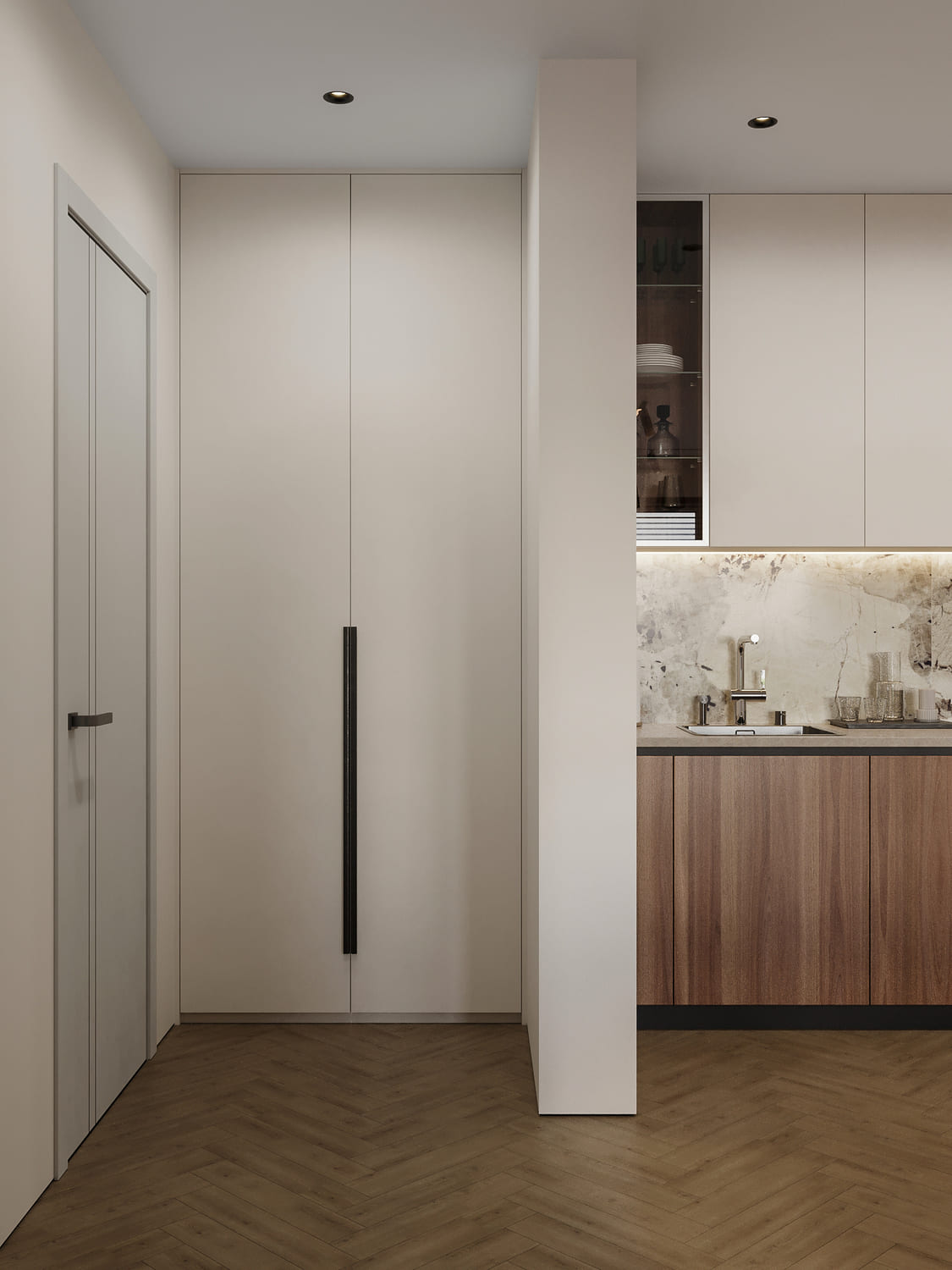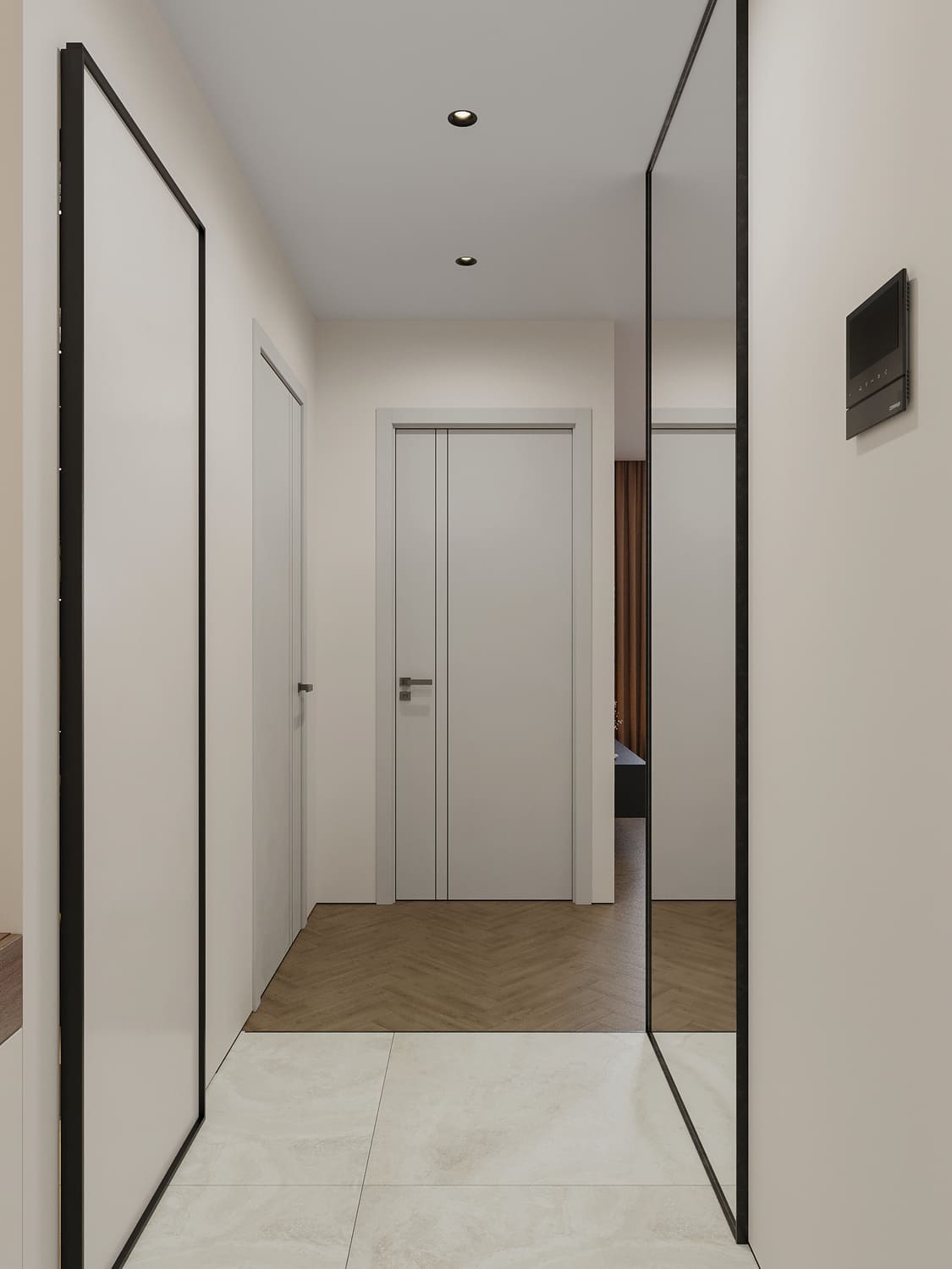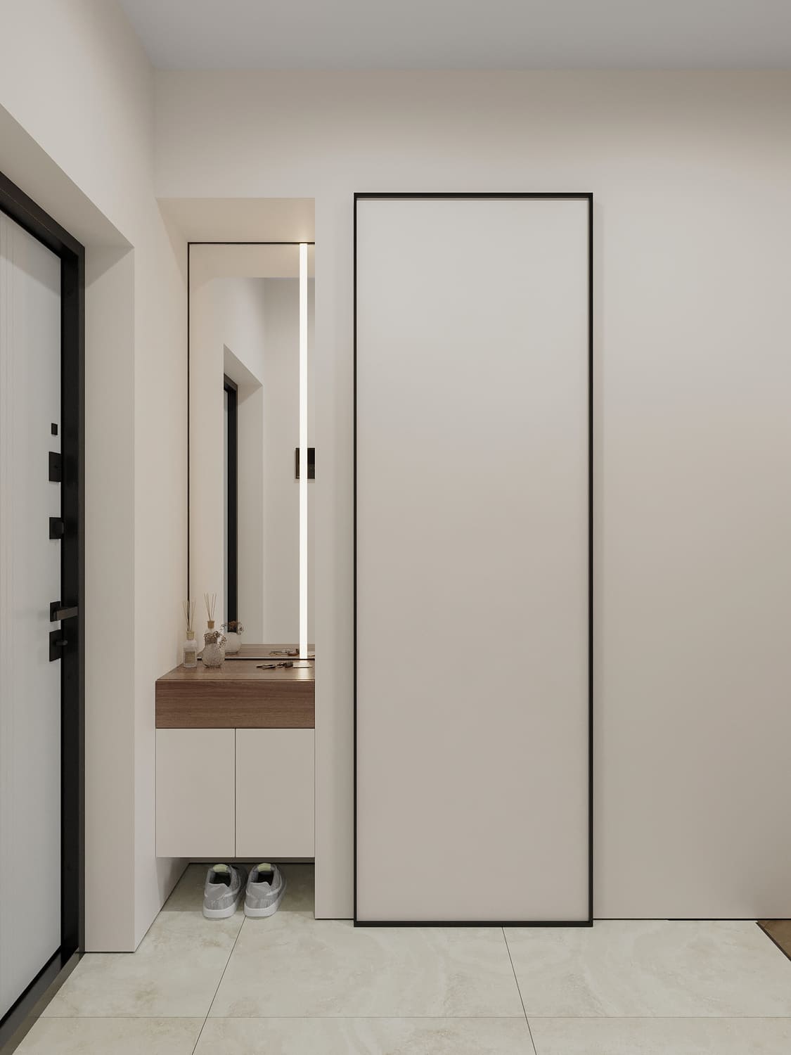 Напольное покрытие выполнено из крупноформатной плитки — это практичное решение для зоны у входа: легко убирать и материал не боится влаги. Встроенные шкафы с гладкими фасадами и большим зеркалом расширяют пространство и позволяют хранить всё необходимое, не перегружая интерьер лишними деталями.