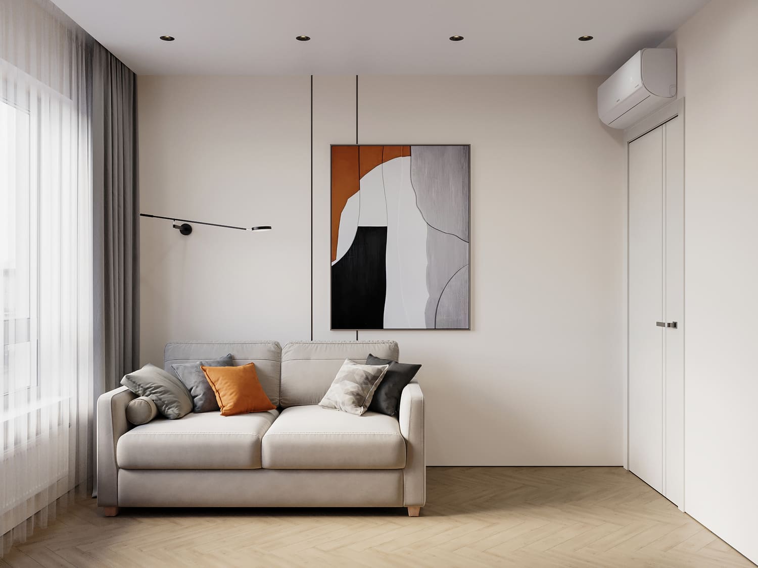 У окна расположился компактный диван, который легко превращает кабинет в гостевую комнату. Картина в абстрактном стиле и акцентные подушки добавляют ярких штрихов и делают интерьер живым.