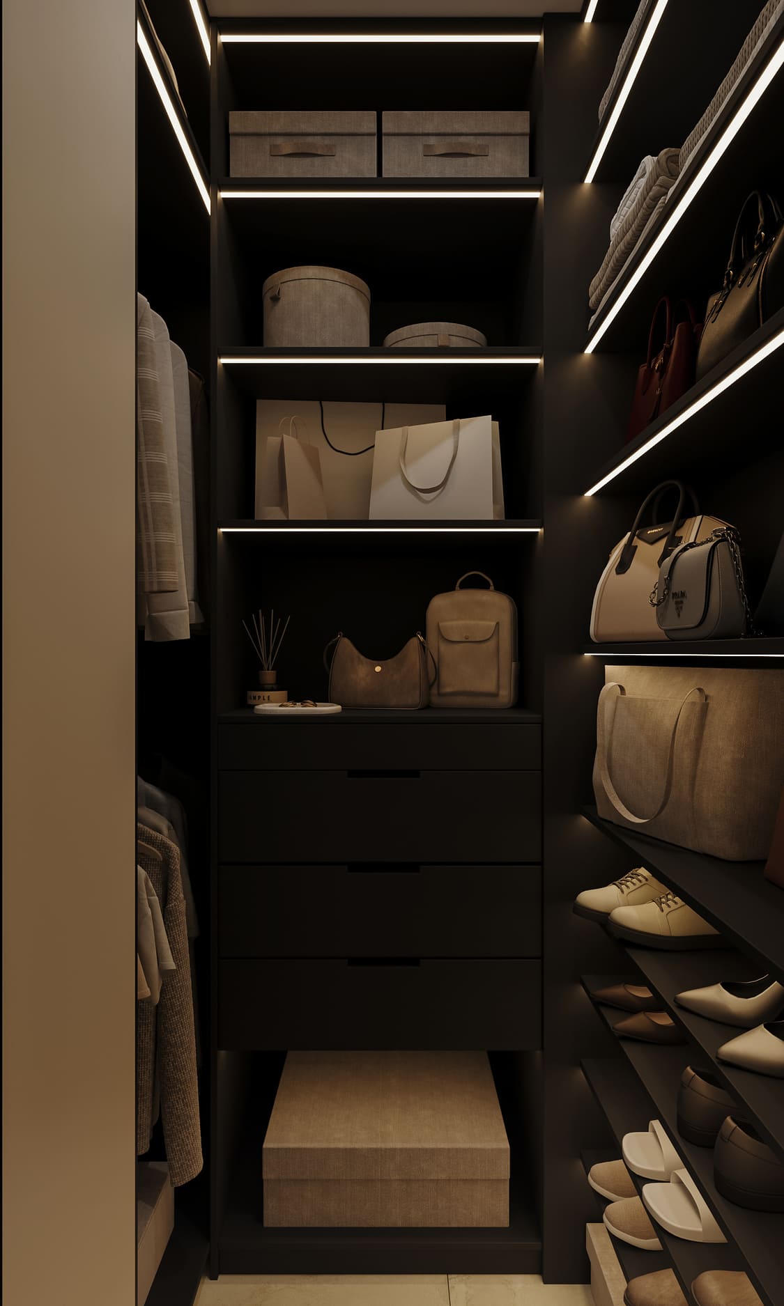 Гардеробная комната выполнена в глубоких тёмных тонах, которые подчеркивают элегантность и создают ощущение приватности. Встроенная подсветка вдоль полок делает интерьер визуально лёгким и одновременно акцентирует внимание на содержимом — одежде, сумках и аксессуарах. Система хранения продумана до мелочей: открытые секции для повседневных вещей, закрытые ящики для мелких предметов, полки для сумок и обуви, а также место для верхней одежды и чемоданов.