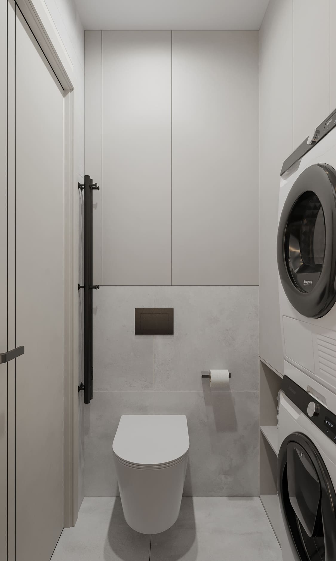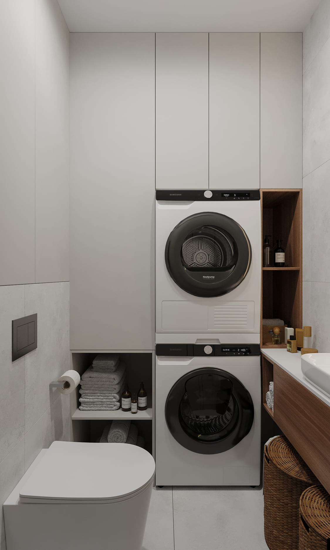 Основное внимание уделено функциональности: стиральная и сушильная машины установлены в колонну, а вокруг них предусмотрены ниши и закрытые шкафы для хранения бытовой химии, полотенец и аксессуаров. Такое решение позволяет максимально эффективно использовать пространство и держать всё под рукой.