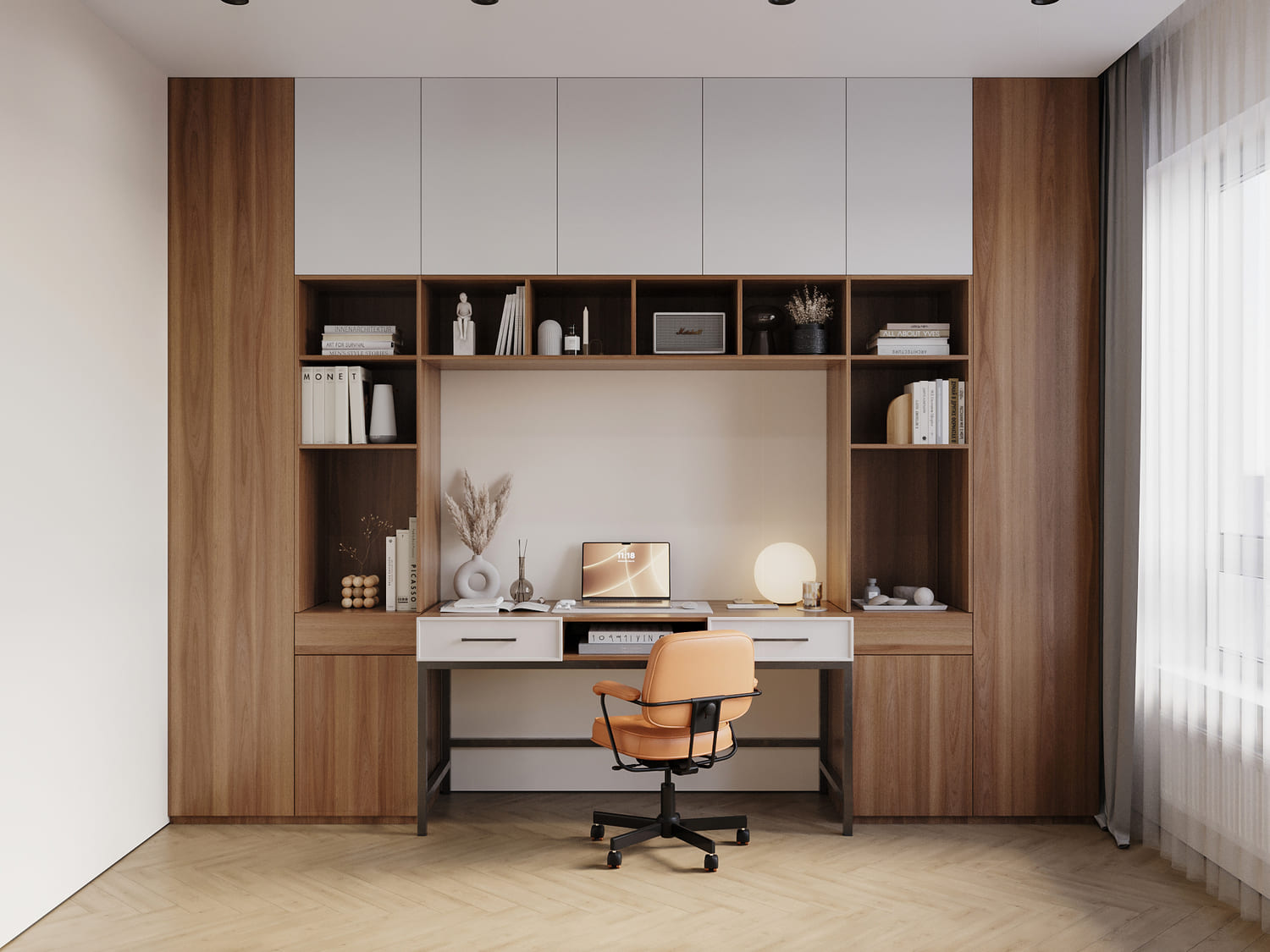 Главный акцент — встроенный рабочий блок с обилием закрытых и открытых секций для хранения. Дерево в отделке придаёт теплоту, а белые фасады верхних шкафов делают композицию лёгкой и визуально невесомой. Рабочий стол дополнен уютной лампой и декоративными деталями, создающими атмосферу личного кабинета, в котором хочется проводить время с пользой.