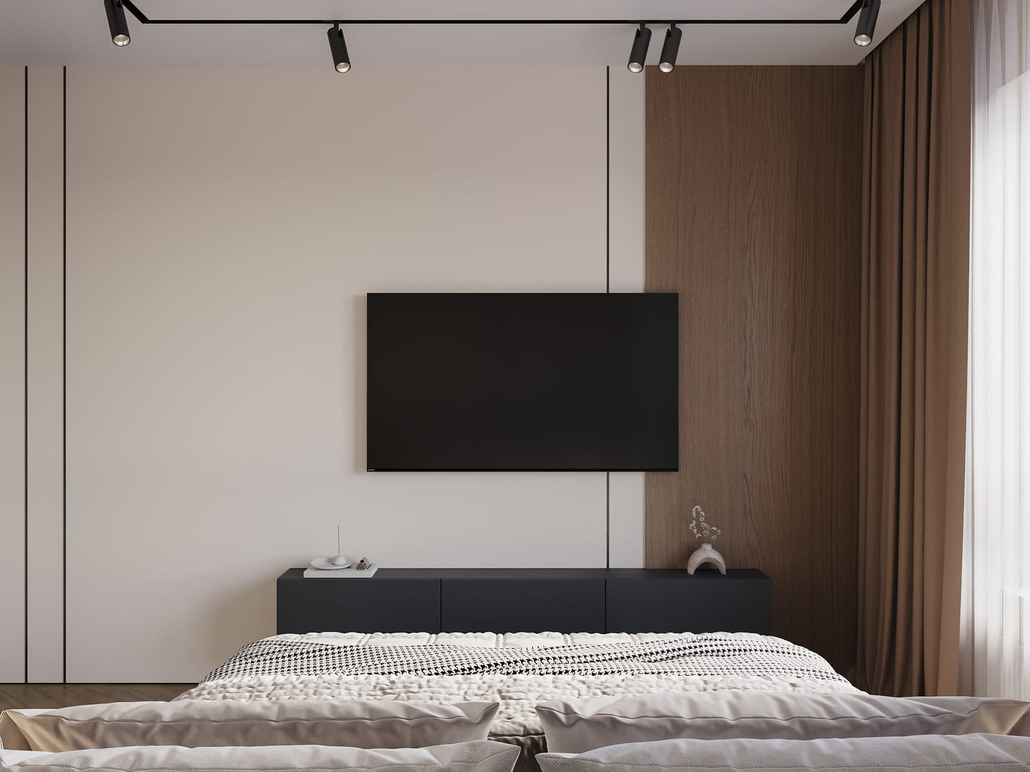 Большие окна с двойными шторами пропускают дневной свет, а вечером создают приватную атмосферу. На противоположной стене — современный ТВ-блок с подвесной тумбой в тёмном цвете, который подчёркивает лёгкость интерьера и не загромождает пространство.