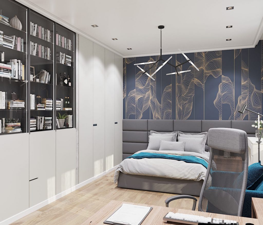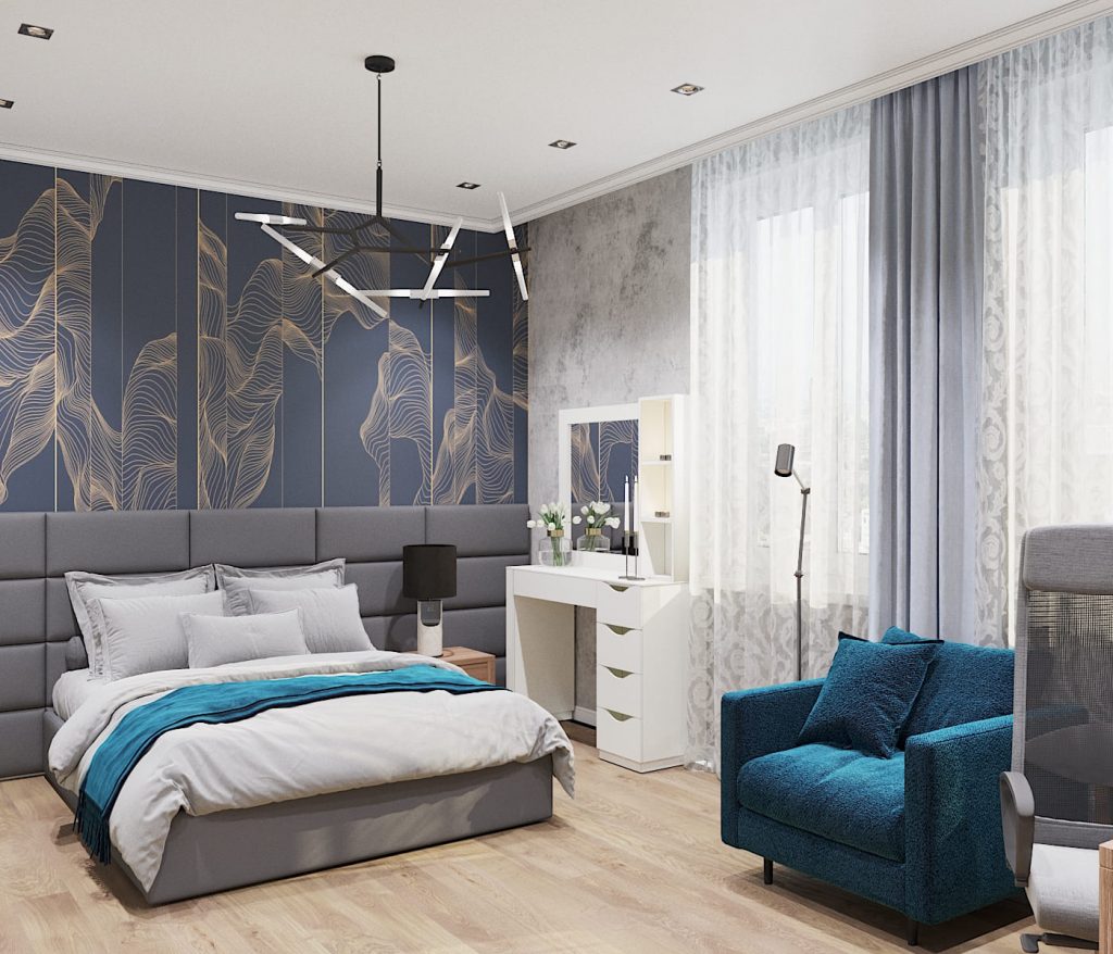 Центр композиции — мягкое серое изголовье на всю стену и акцентные панели с золотисто-синим рисунком. Они задают тон всей комнате: современно, с намёком на арт-деко. Освещение поддерживает стиль — потолочный светильник с геометрией добавляет динамики, а локальные источники света делают обстановку уютной.