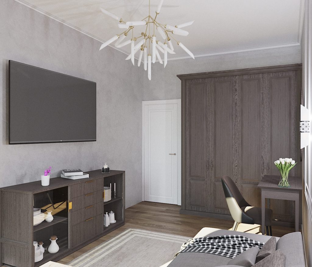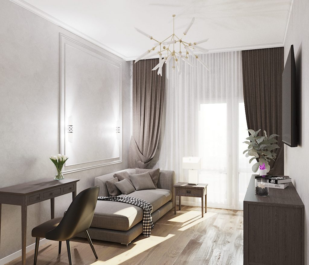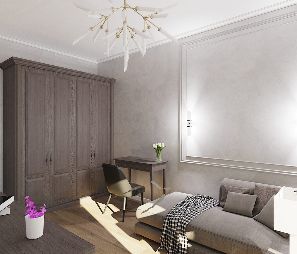 Интерьер выполнен в спокойной серо-бежевой гамме. Стены отделаны декоративной штукатуркой с лёгкой бетонной фактурой, которая добавляет глубины и современного настроения. Напольное покрытие из дерева делает пространство тёплым и «домашним». Встроенный шкаф с распашными фасадами даёт дополнительное хранение, при этом полностью сливается с фоном и не перетягивает внимание. Белые вертикальные шторы на окне пропускают мягкий дневной свет и скрывают от посторонних глаз, сохраняя приватность.