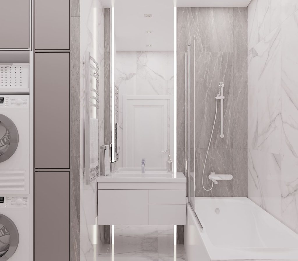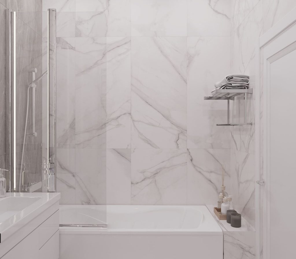 Интерьер выдержан в светлой мраморной гамме, которая визуально расширяет пространство и создаёт эффект спа-зоны. Матовое и глянцевое покрытие плитки чередуется, добавляя глубины и фактурности.