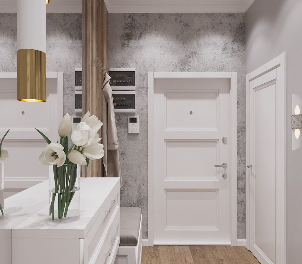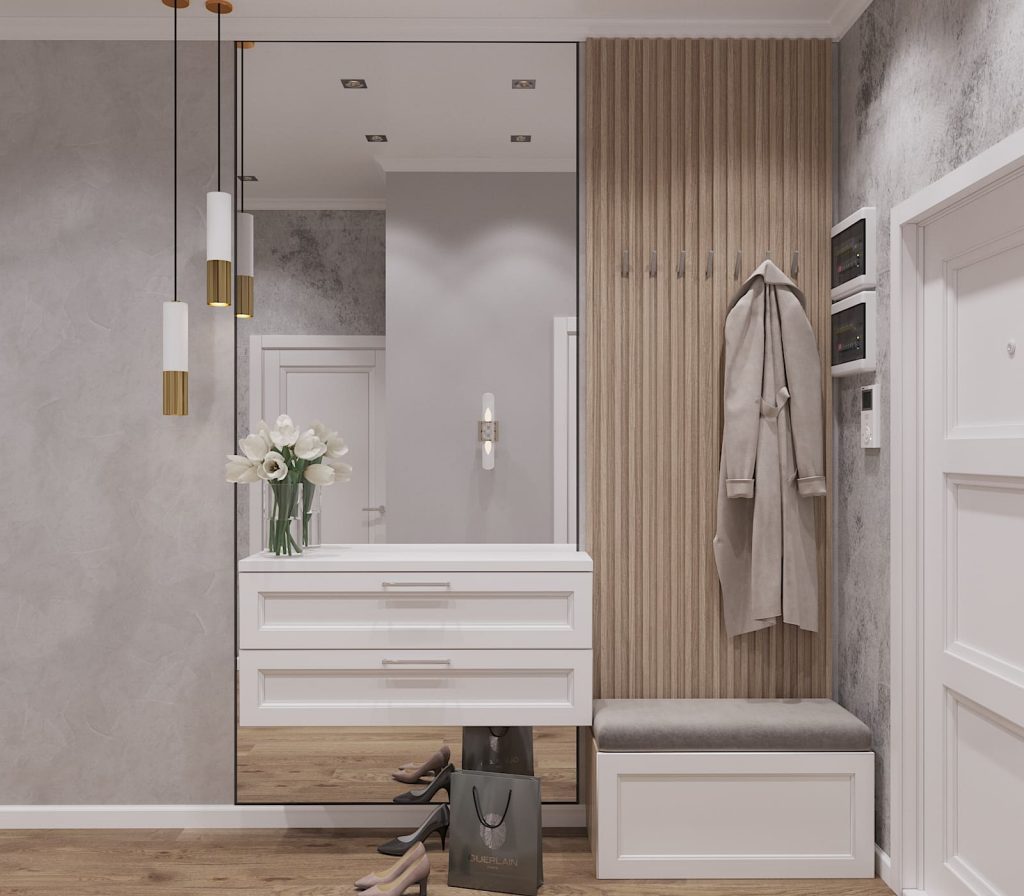 Двери и мебель перекликаются по цвету и стилю, формируя цельный образ. Мягкая скамья под зеркалом не только удобна, но и визуально разгружает пространство. А рейки из светлого дерева с крючками — стильное и функциональное решение, которое отделяет зону хранения верхней одежды от остального пространства. Щитки аккуратно интегрированы в стену — никаких лишних глаз на виду.