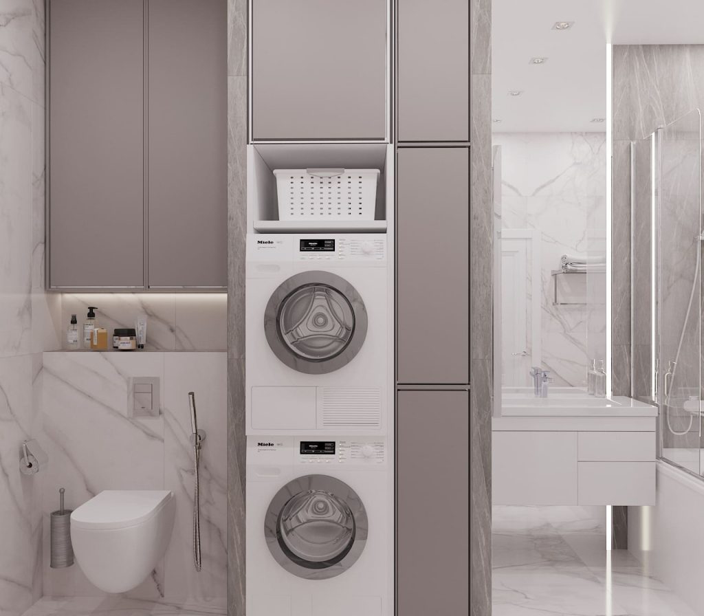 Отдельного внимания заслуживает зона хранения. Строгие лаконичные шкафы в светло-сером цвете интегрированы максимально грамотно: они скрывают бытовую технику, корзину для белья и всю бытовую мелочёвку. Здесь предусмотрено всё — от сушильной машины до высоких вертикальных секций для запасов бытовой химии и полотенец.