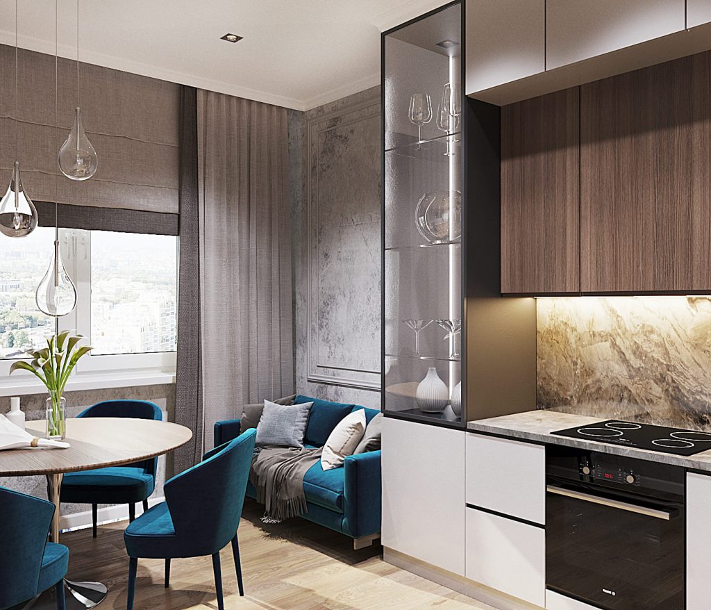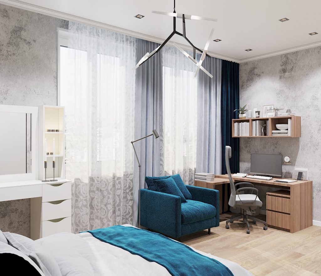 Интерьер выдержан в сдержанной, но благородной палитре: серые, графитовые и голубые оттенки создают спокойный фон, а глубокий синий текстиль добавляет выразительности.