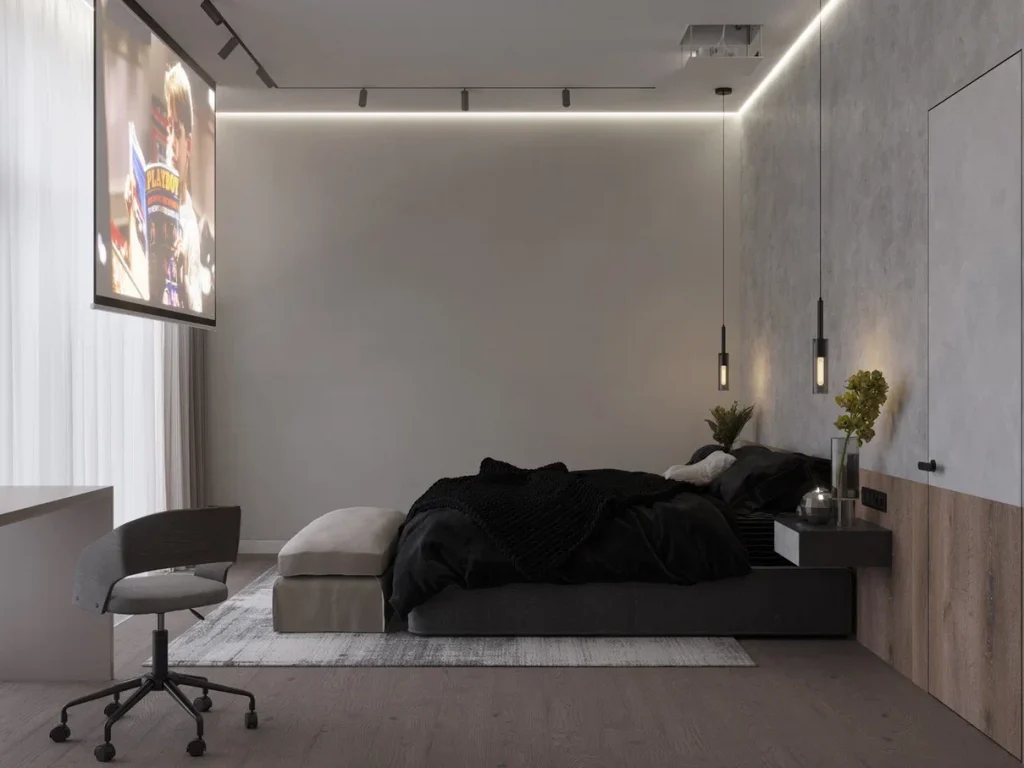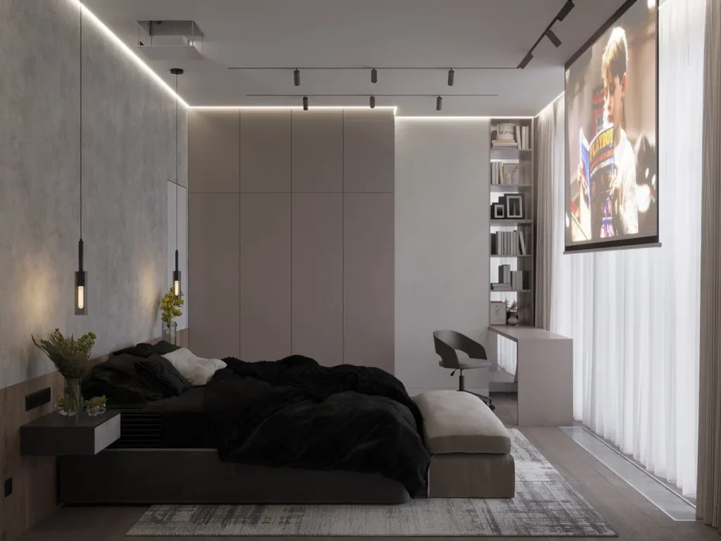 Особое внимание уделено не только эстетике, но и комфорту: в спальне организована полноценная рабочая зона и установлен проектор с выдвижным экраном — решение, которое позволяет устроить полноценный домашний кинотеатр прямо у кровати.