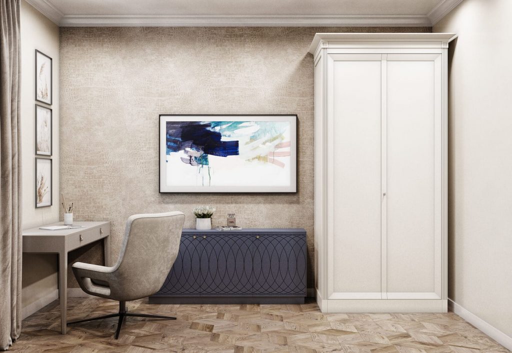 Вторая спальня — самая светлая и воздушная в квартире. Здесь спокойная палитра дополнена нежными акцентами и лаконичной графикой на стене за изголовьем — всё ради ощущения лёгкости и уюта. Мягкое изголовье и пастельный текстиль создают расслабляющее настроение, а рабочая зона и туалетный столик вписаны в интерьер так, чтобы не нарушать его спокойный ритм. Абстрактная картина и декоративные элементы добавляют индивидуальности, но не перетягивают внимание на себя.