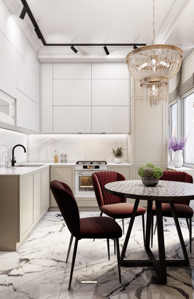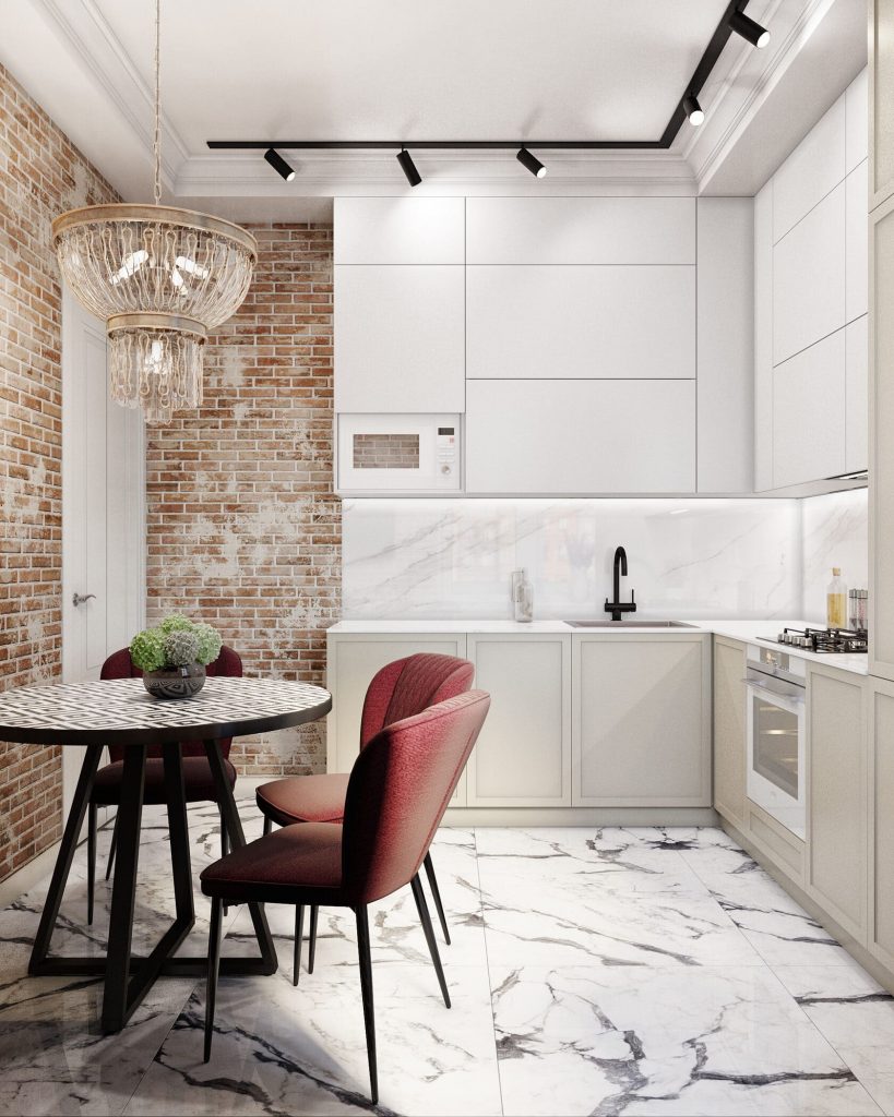 Белые фасады с лаконичной геометрией, мраморный фартук и индустриальные трековые светильники создают чистую современную основу. Кирпичная кладка добавляет интерьеру фактуры и настроения, а винные бархатные стулья и нарядная люстра поддерживают общее ощущение уюта и праздничности.