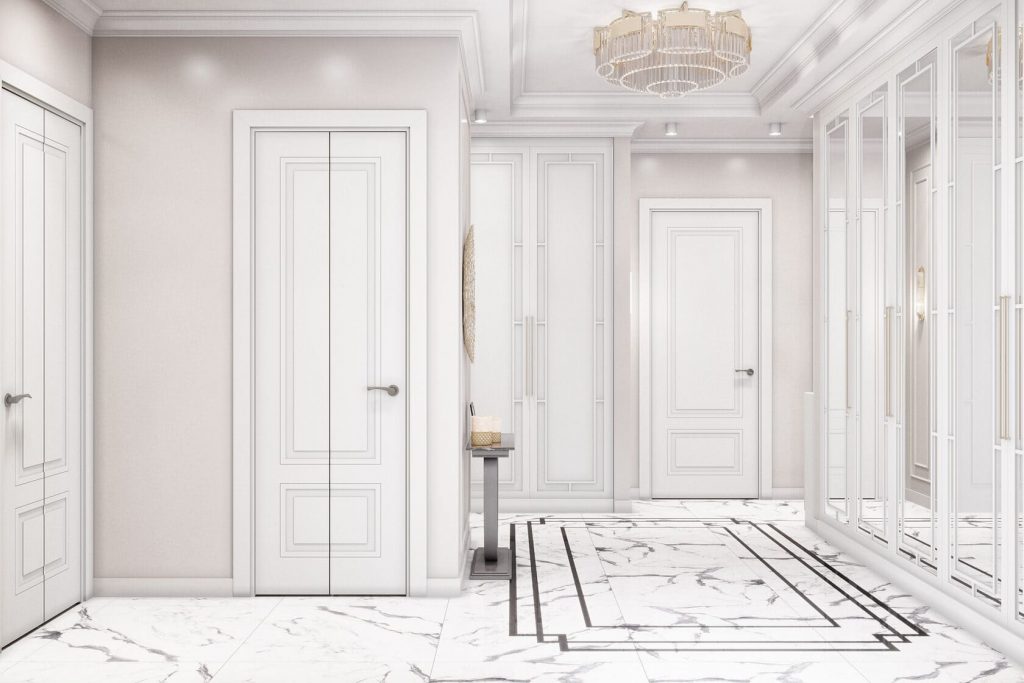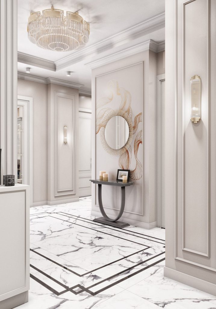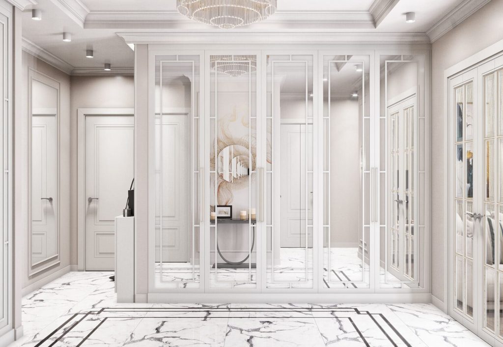 Прихожая и коридор встречают светом, зеркалами и ощущением торжественности — именно таким интерьер и задумывался по желанию заказчицы: нарядным, но уютным.