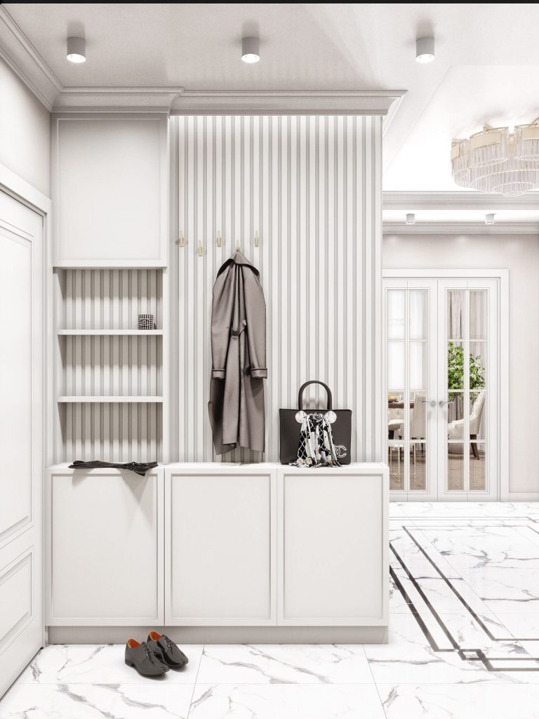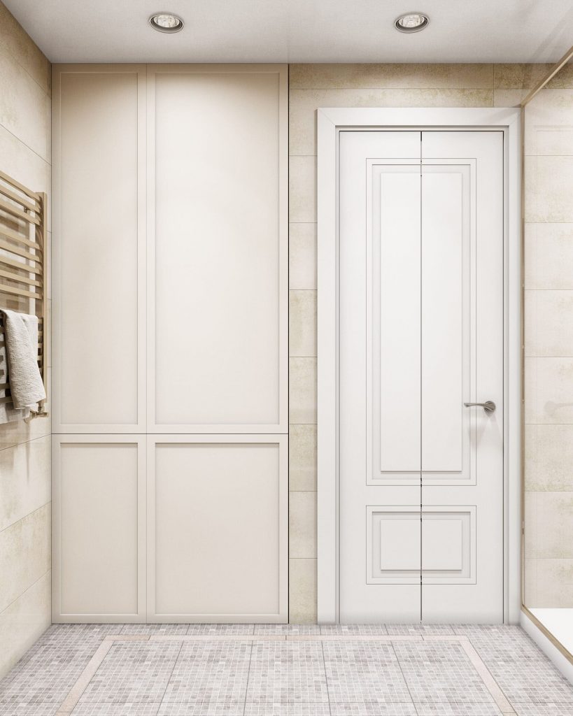 Светлая гамма, мраморный керамогранит и классические молдинги создают элегантную основу, а декоративное панно и круглое зеркало добавляют динамики. Зеркальные фасады визуально расширяют пространство, а светильники с хрусталём подчёркивают атмосферу лёгкости и комфорта.
