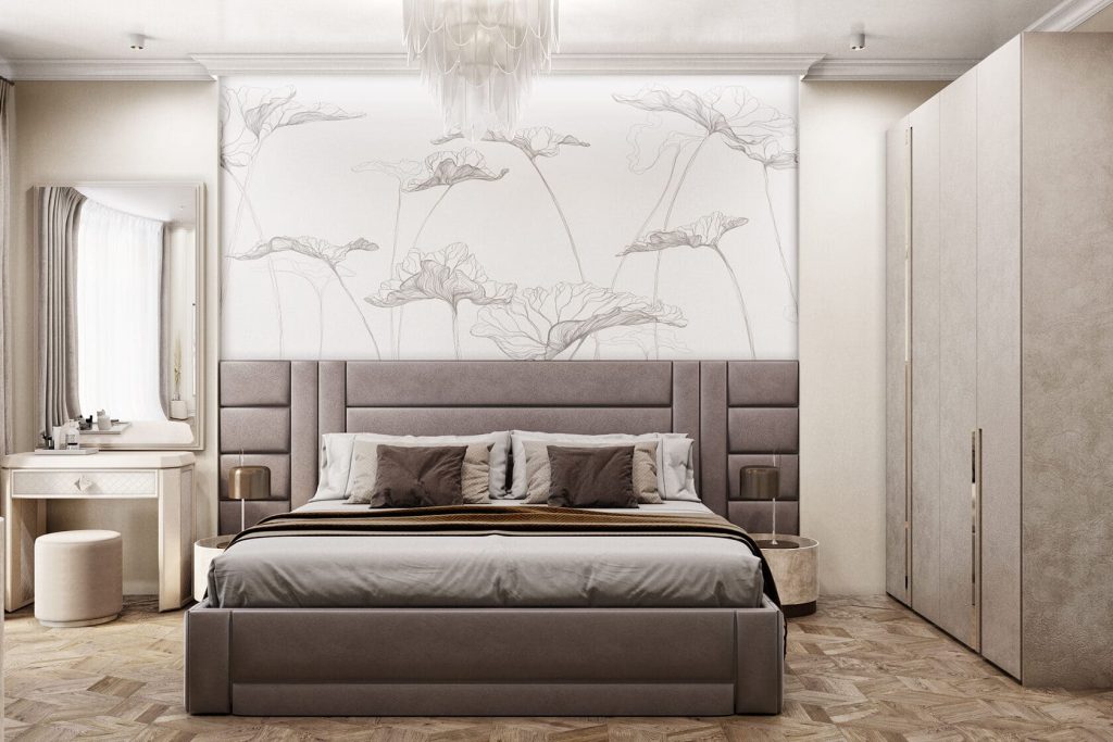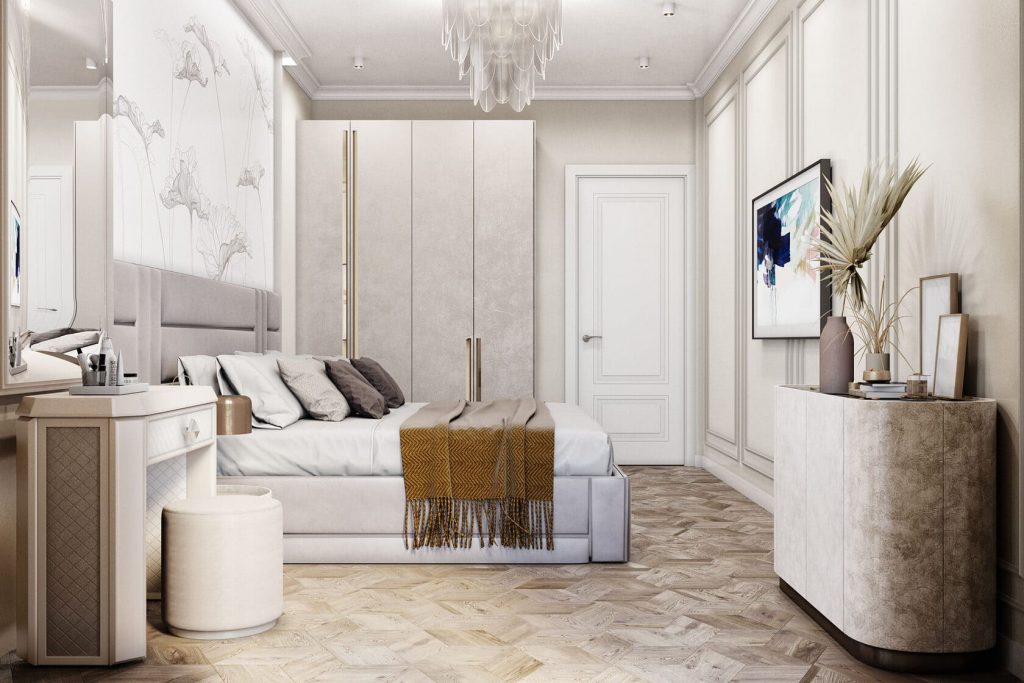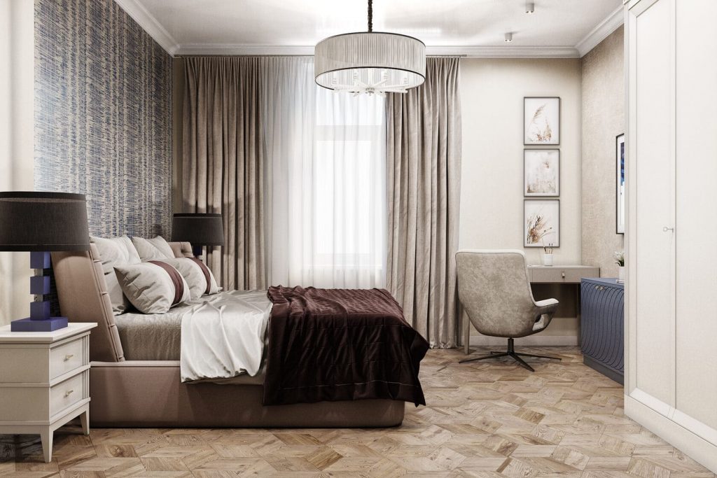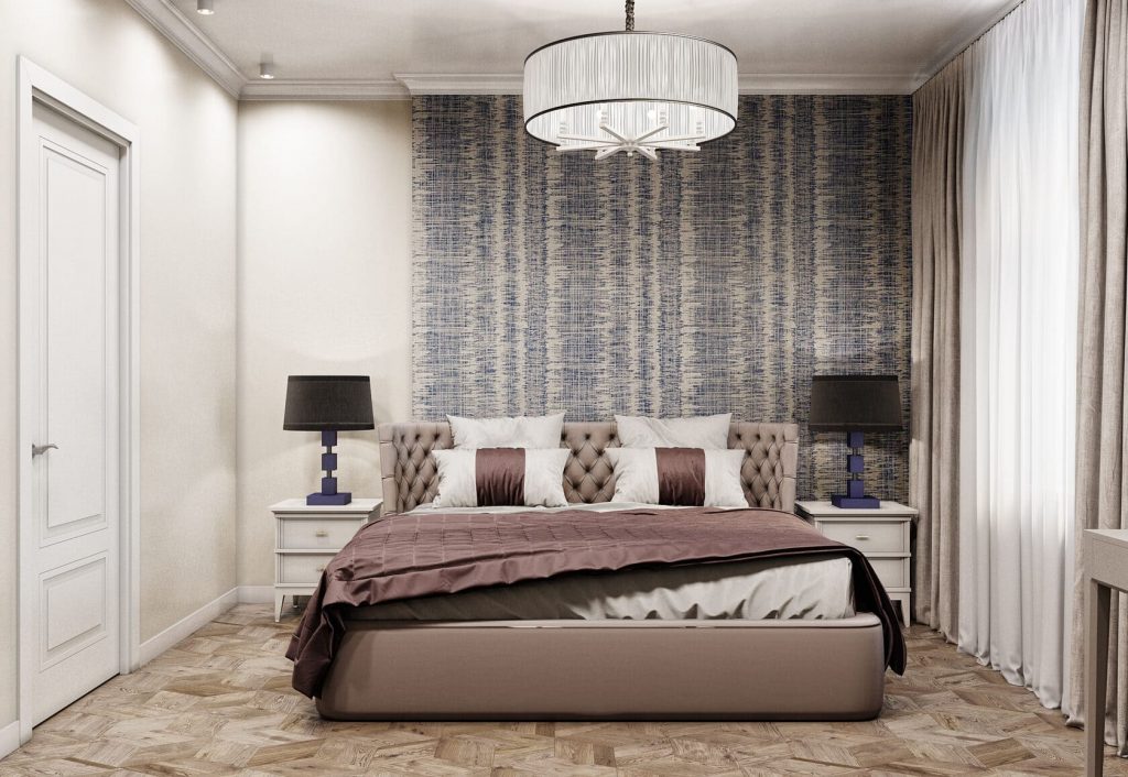 Первая спальня получилась особенно уютной и сдержанно элегантной. Здесь классическая основа дополнена современными акцентами — по желанию семьи сделать интерьер актуальным, но не слишком строгим. Тёплая палитра, фактурные обои за изголовьем и благородный текстиль создают атмосферу покоя. Мягкое изголовье, декоративные подушки и тёплый плед придают комнате ощущение защищённости. Рабочая зона у окна аккуратно встроена в интерьер и не перегружает пространство.