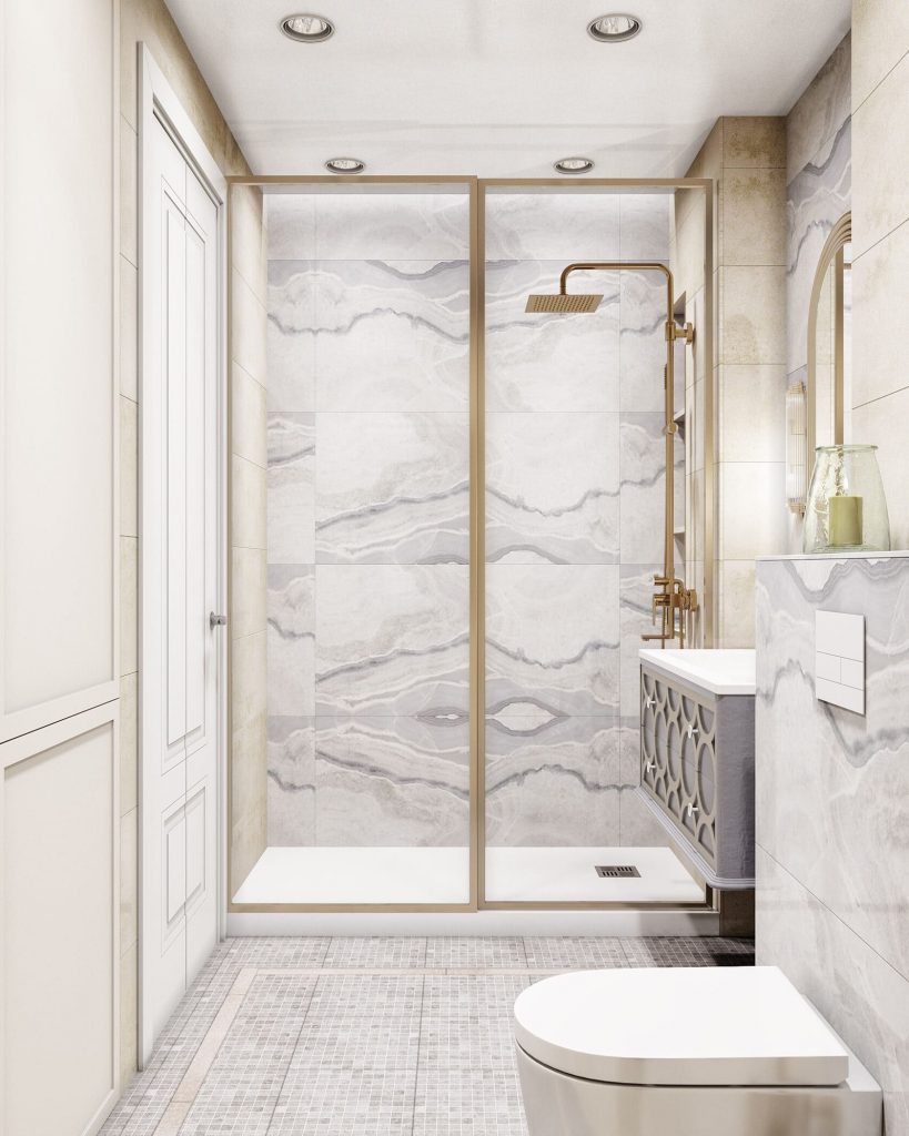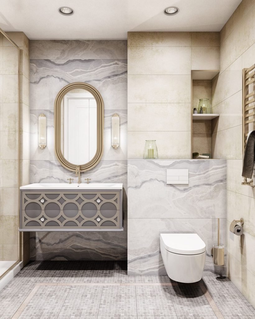 Душевая комната получилась сдержанной, но выразительной — сочетание светлого камня, плавных текстур и бронзовых акцентов делает интерьер благородным и лёгким одновременно. Парящая тумба с декоративным фасадом и овальное зеркало добавляют нотку классической нарядности. Душевая зона оформлена крупноформатной плиткой с мраморным рисунком, которая смотрится эффектно, но не перегружает. Функциональность не в ущерб эстетике: встроенный шкаф, открытые ниши и тёплый пол делают эту комнату максимально удобной для ежедневного использования.