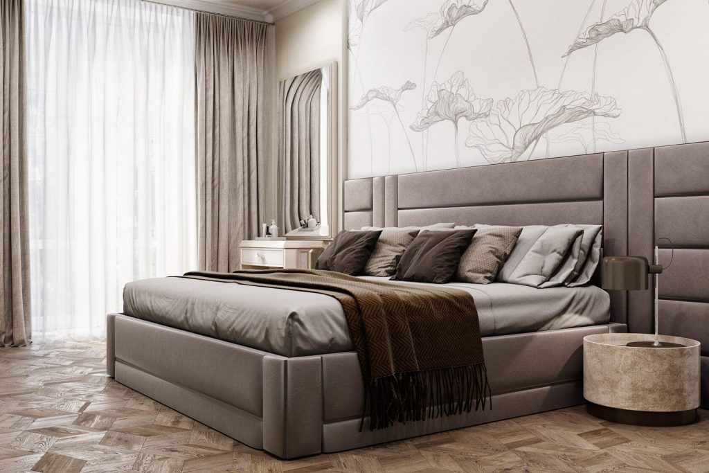 Стены оформлены декоративными панелями с мягкой текстурой, которые добавляют глубины, но не перегружают интерьер.