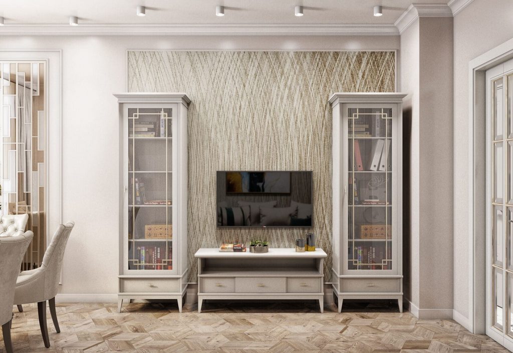 Обеденная зона продолжает классическую линию: стулья с каретной стяжкой, круглая люстра, аккуратные витрины по бокам от ТВ-зоны — всё это делает пространство цельным и располагающим к семейным встречам.