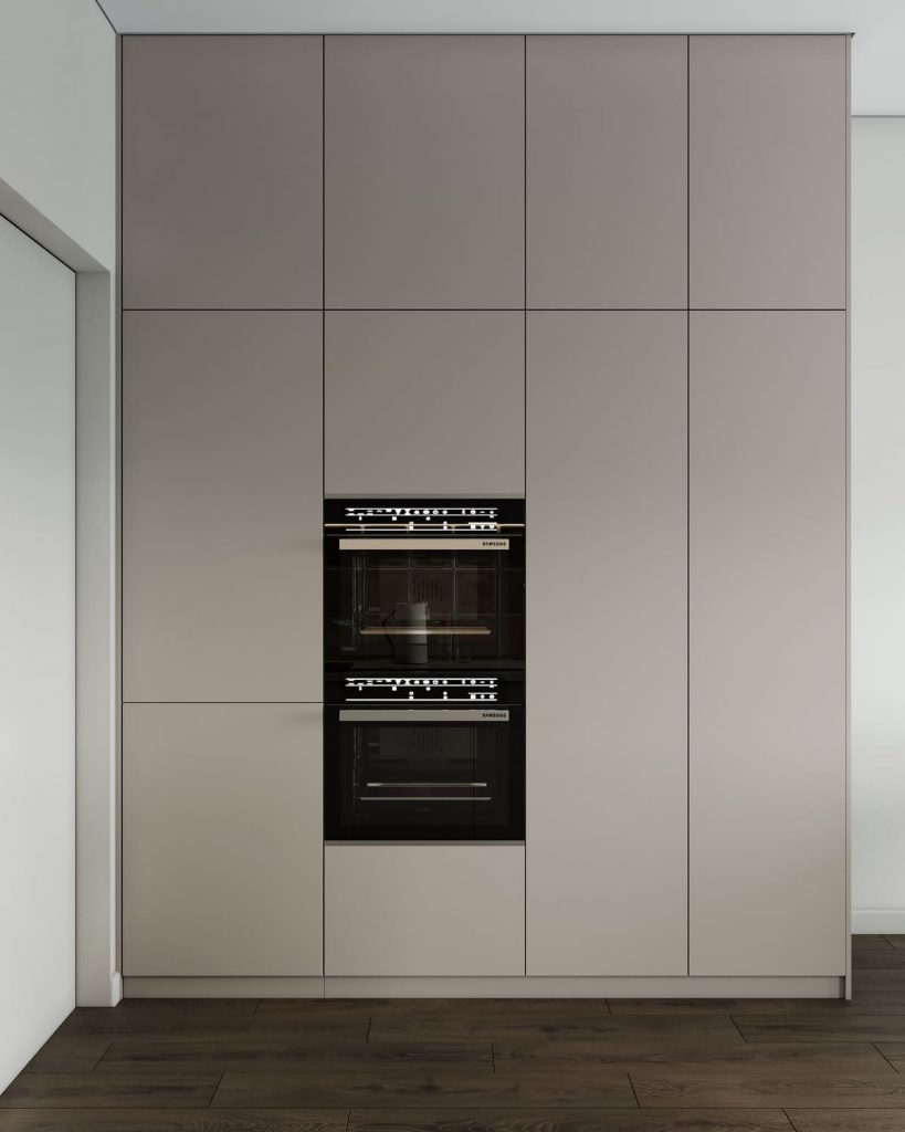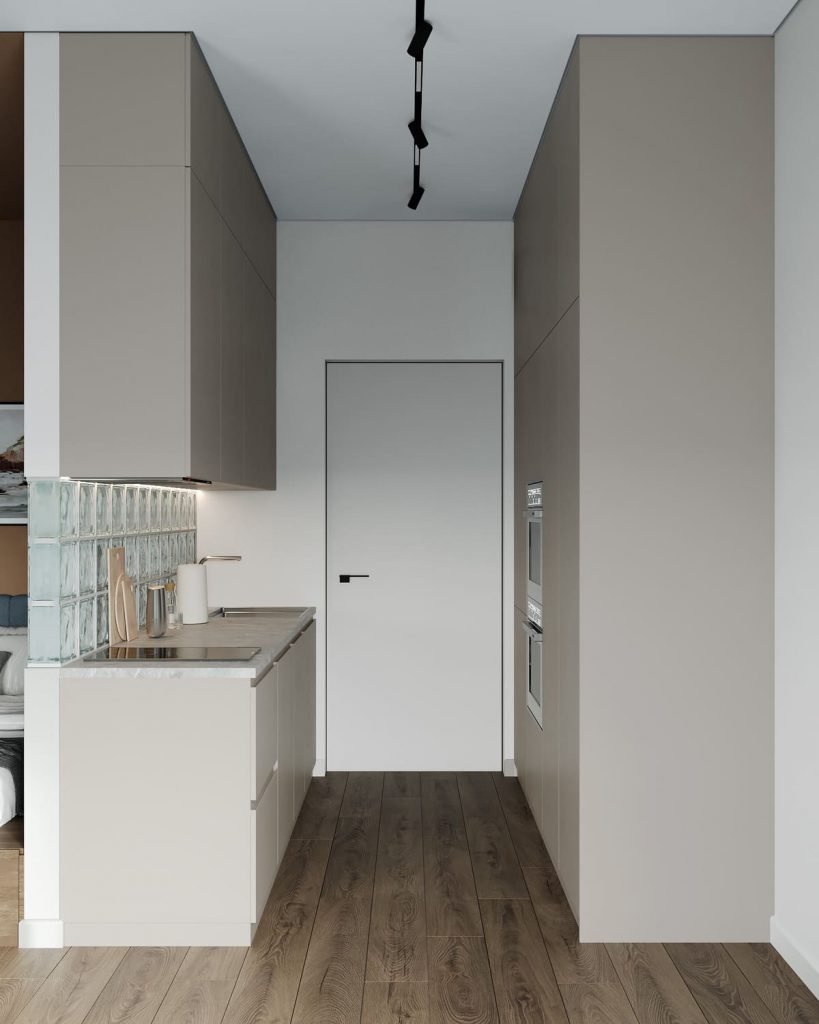 Кухня лаконичная, в светло-бежевых тонах. Матовое покрытие фасадов и отсутствие ручек создают чистый, минималистичный образ. А вот фартук здесь — особенный: он выполнен из стеклоблоков, которые перекликаются с перегородкой у кровати и визуально расширяют пространство. Полноценная встроенная техника, вместительные шкафы и продуманная система хранения позволяют действительно готовить, а не просто разогревать.