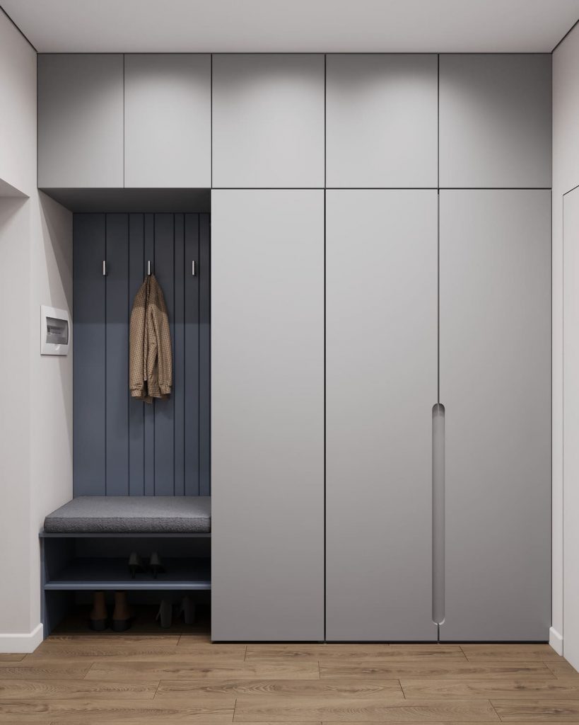 Нейтральные серо-бежевые тона подчёркивают чистоту и порядок, а глубокий синий в отделке ниши добавляет акцента и визуальной глубины. Встроенные крючки, открытые полки и верхние антресоли делают систему хранения максимально гибкой. Вертикальное зеркало в полный рост и мягкая подсветка у пола добавляют комфорта — и визуально вытягивают пространство.