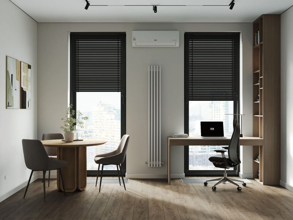 Рабочее место встроено в оконный проём. Простой стол из дерева и высокая полка с книгами и аксессуарами — всё, что нужно для сосредоточенной работы. Благодаря панорамному окну, дневной свет делает эту зону особенно приятной.