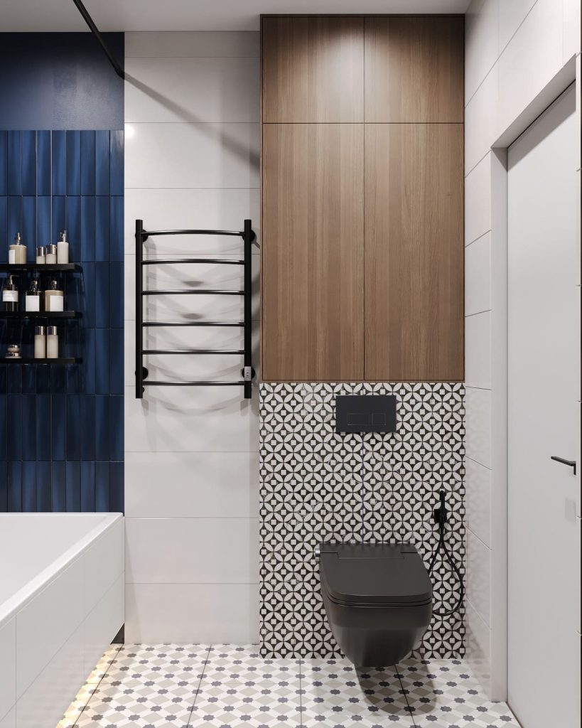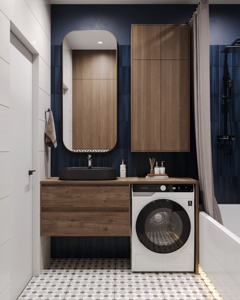 Цветовая палитра сочетает тёплое дерево, нейтральную керамику и глубокий синий оттенок, выбранный по желанию заказчика. Именно этот насыщенный синий стал главным акцентом: вертикальная плитка в зоне ванны и за раковиной добавляет интерьеру глубины и графичности. Белые плоскости и мелкая геометрия на полу уравновешивают композицию, не перегружая её.