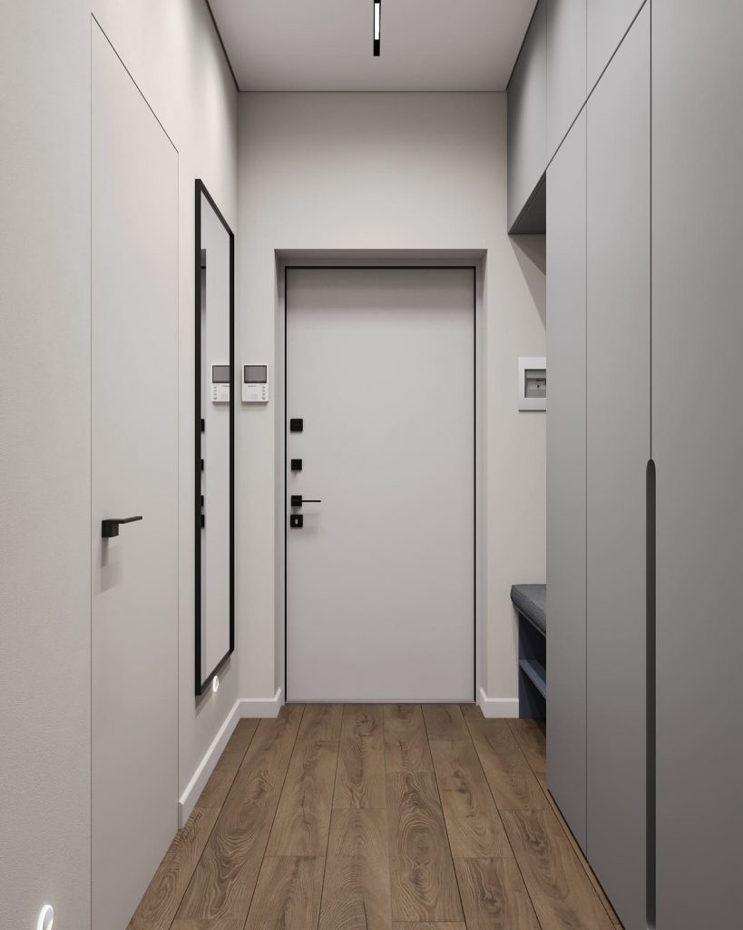 Прихожая получилась компактной, но очень продуманной: высокий встроенный шкаф решает вопрос хранения одежды, обуви и сезонных вещей, а встроенная ниша с мягкой скамьёй создаёт удобное место для переобувания. Всё под рукой — и при этом ничего лишнего на виду.