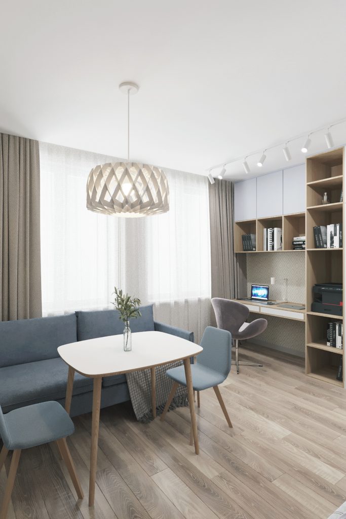 Серый-голубой диван — не только комфортное место для отдыха, но и дополнительное спальное место для гостей. Раскладная конструкция позволяет легко адаптировать пространство, а удобное расположение напротив телевизора делает эту зону идеальной для вечернего досуга. Светлый обеденный стол с деревянными ножками добавляет лёгкости интерьеру, а стулья с мягкой обивкой поддерживают общую цветовую гамму.