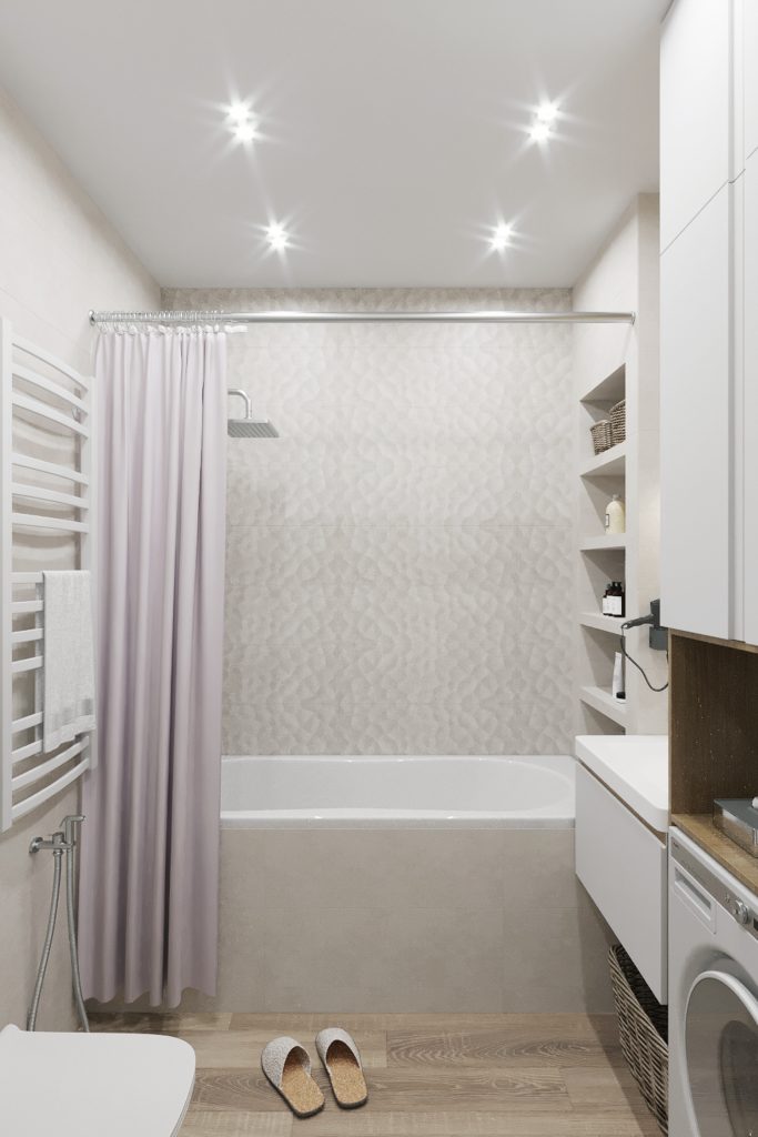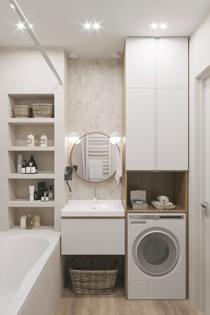Стиральная машина с функцией сушки встроена в нишу, а над ней предусмотрена удобная полка для хранения свернутых полотенец и корзины с мелочами.
