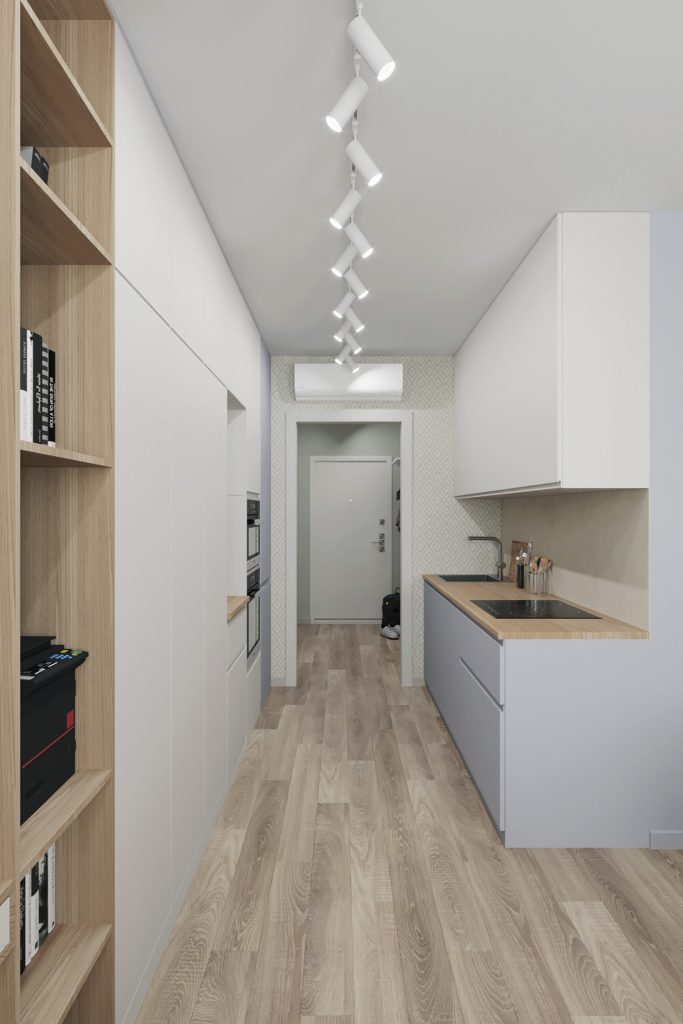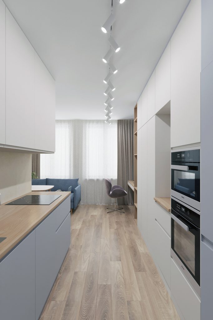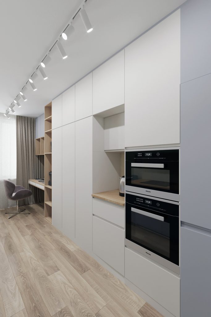 Система хранения продумана до мелочей: встроенная колонна с техникой (духовой шкаф и микроволновая печь), вместительные шкафы и рабочая зона с варочной поверхностью. Компактная мойка и встроенная посудомоечная машина помогают поддерживать порядок без лишних усилий. Напротив расположилась зона с холодильником, небольшой рабочей поверхностью для бытовых приборов (чайник, тостер, мультиварка) и дополнительными местами для хранения.