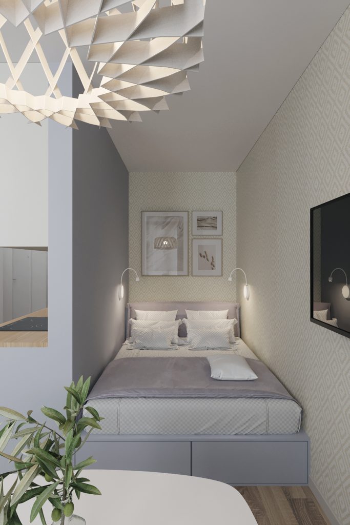 Кровать расположена в нише за кухонной стенкой, что визуально отделяет её от остального пространства. Это уютное место с мягким текстильным изголовьем, встроенными розетками и полкой для необходимых мелочей. Дополнительные выдвижные ящики под кроватью обеспечивают дополнительное хранение без загромождения комнаты. Светлые оттенки и мягкие текстуры создают атмосферу отдыха и спокойствия.