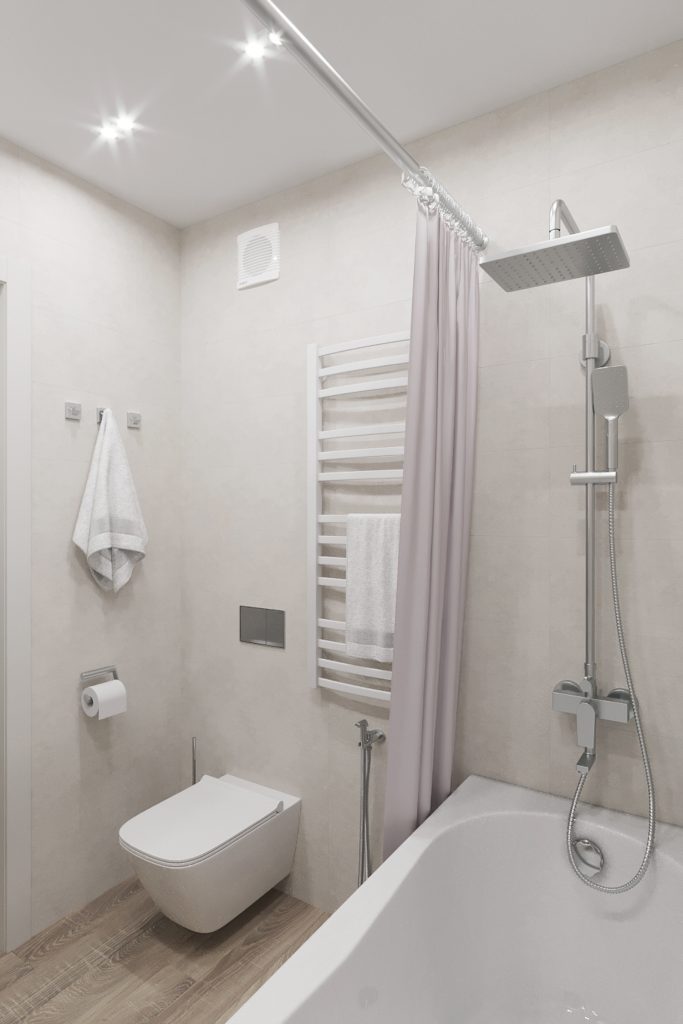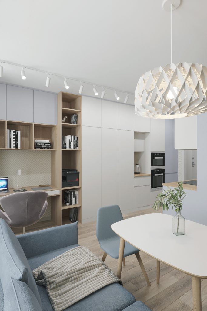 Дизайн-проект небольшой квартиры-студии для женщины 50 лет с максимальной функциональностью в спокойных пастельных тонах с комнатой, включающую кухонную, гостиную и спальную зоны, и санузлом