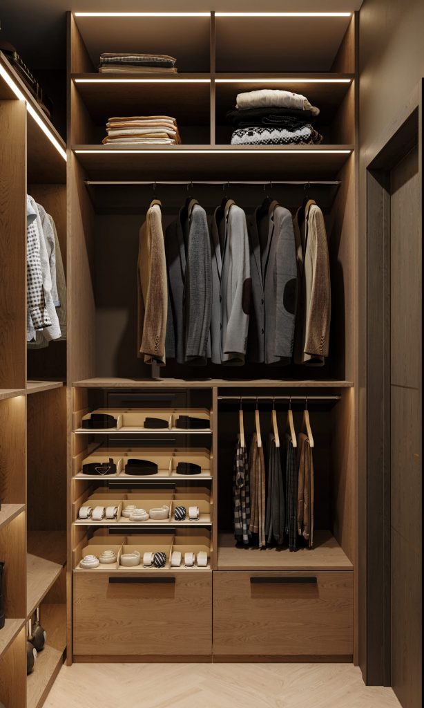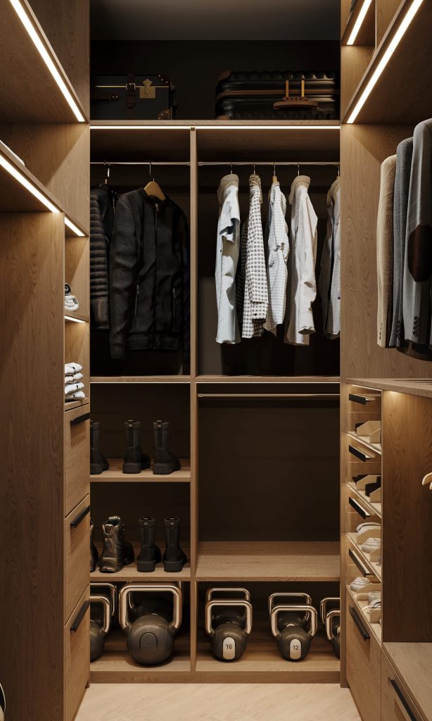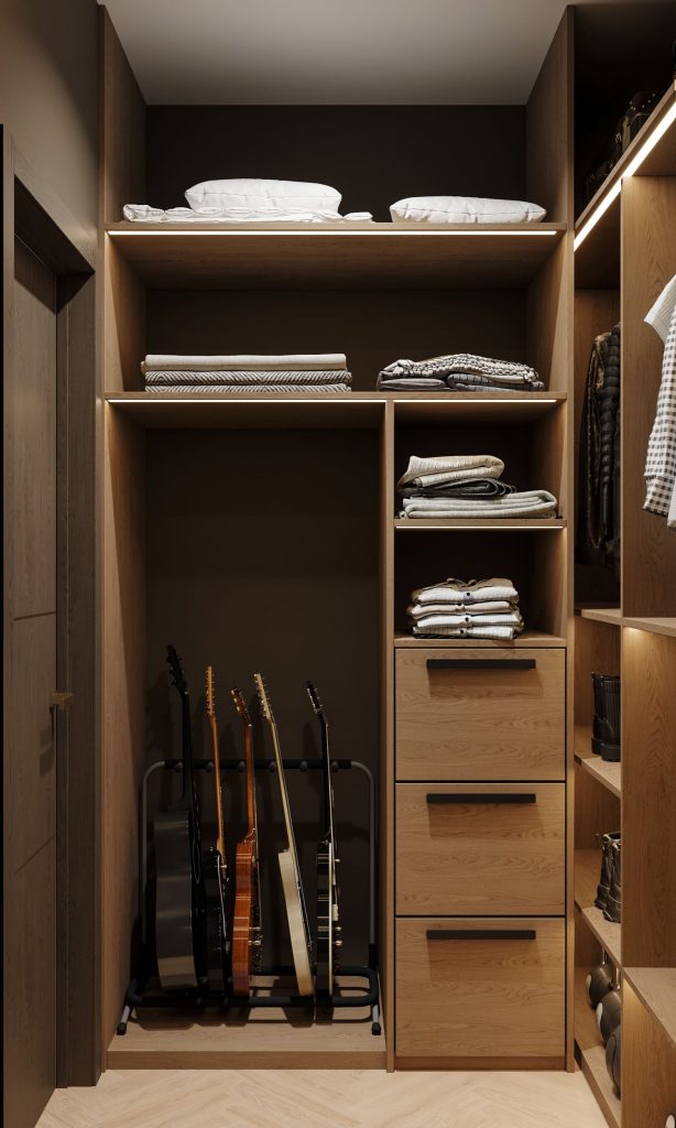 Понимая потребность клиентов в обширном хранении, мы спроектировали гардеробную с П-образной компоновкой и открытыми секциями. Выдвижные ящики с органайзерами и стеллажи для обуви и спортивного инвентаря обеспечивают порядок и лёгкий доступ к вещам. Мы предусмотрели отделение для музыкальных инструментов, зная, что муж увлекеются музыкой, что добавляет индивидуальности пространству. Подсветка и продуманная организация создают комфортную и функциональную гардеробную, соответствующую современным потребностям семьи.