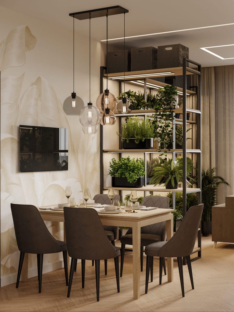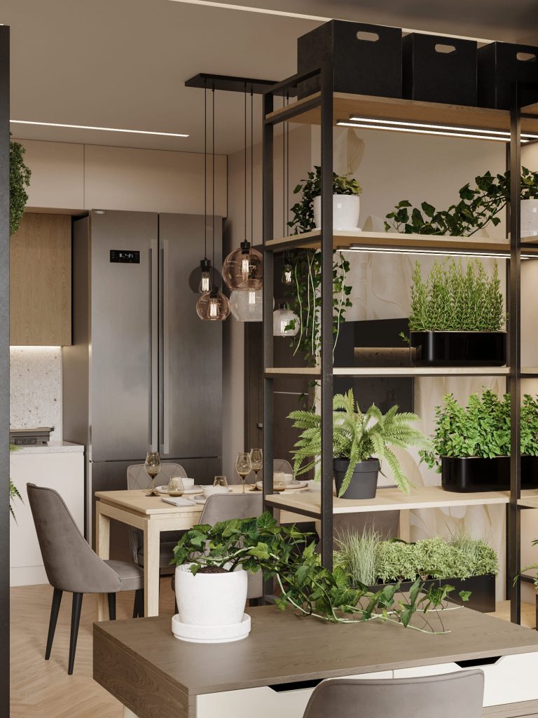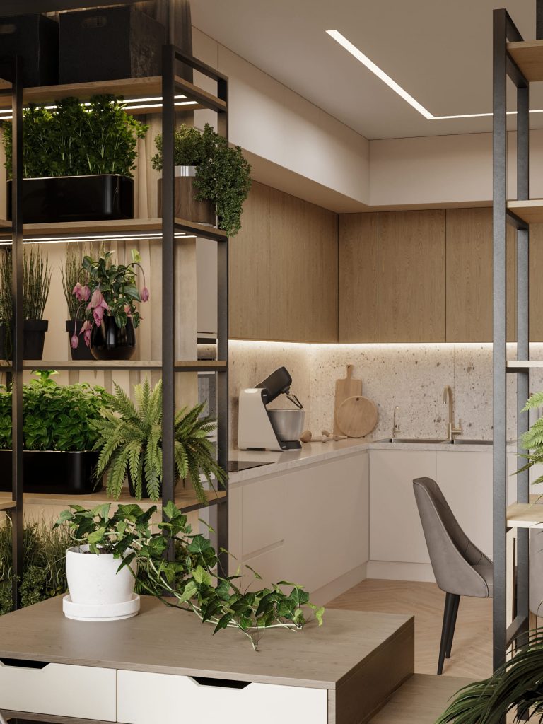 Открытые полки с зелёными растениями придают кухне живость и свежесть, отражая любовь семьи к природе. Эргономичное расположение кухонной зоны упрощает процесс готовки, а барные стулья с мягкими сиденьями создают уютное место для семейных завтраков. Подсветка рабочей зоны повышает комфорт и безопасность при приготовлении пищи, отвечая потребностям активной семьи.