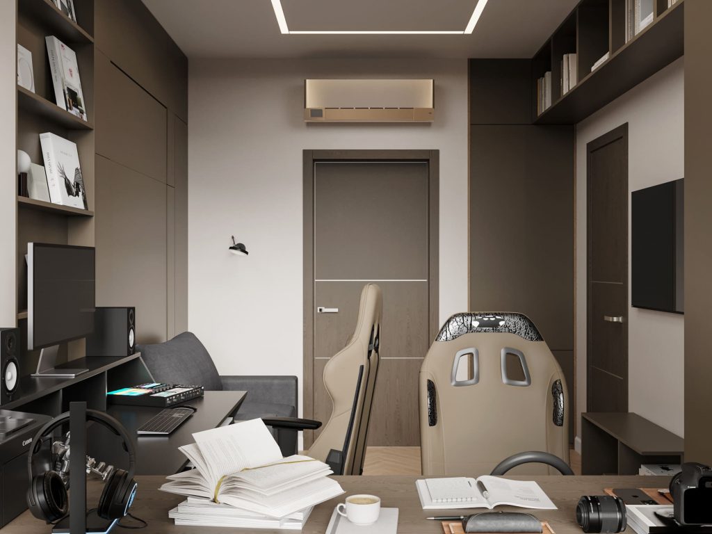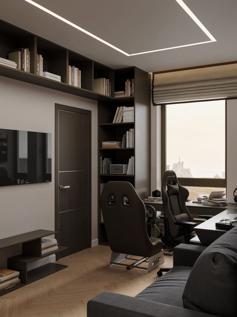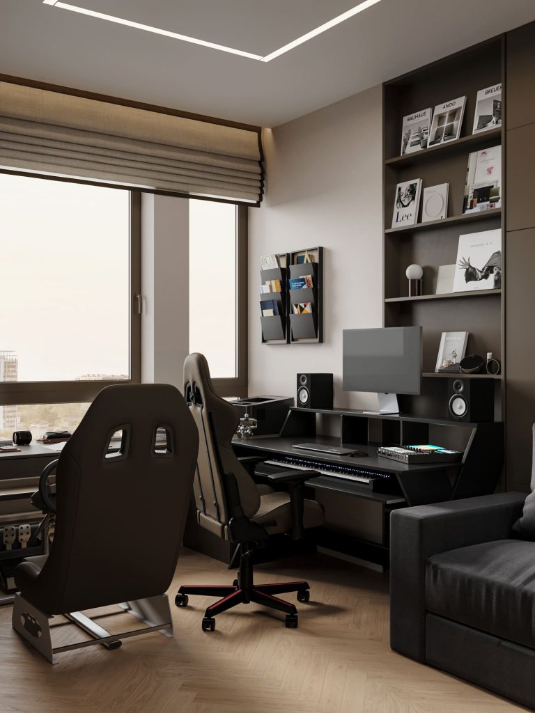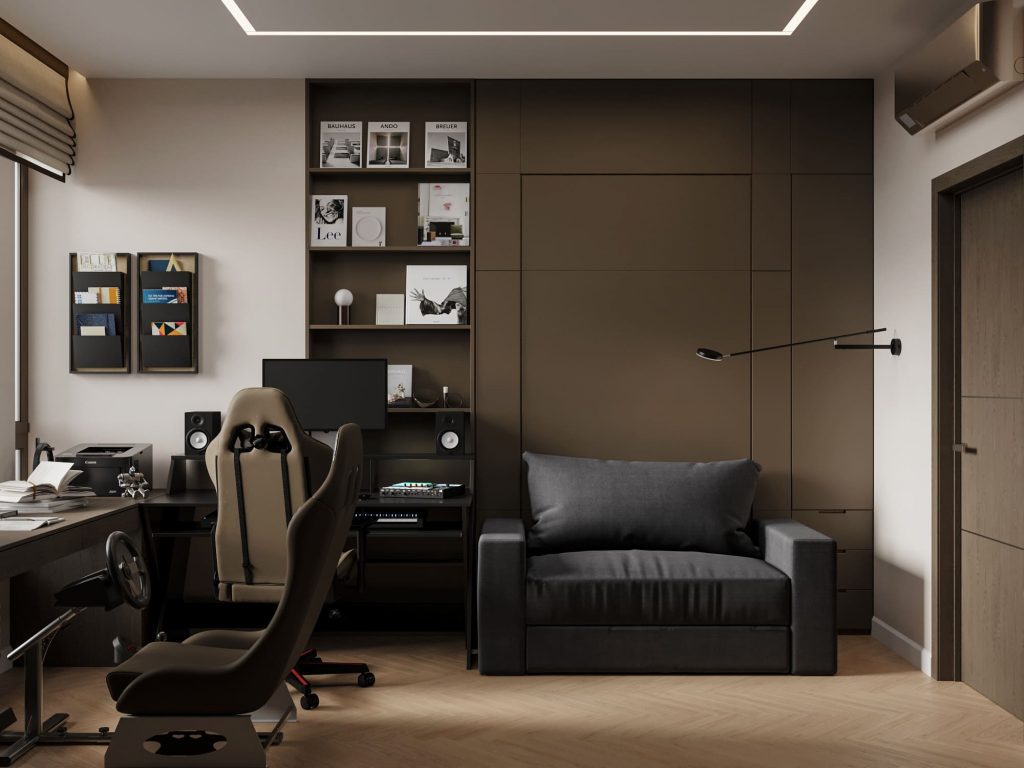 Акустическая отделка стен улучшает концентрацию, снижая внешние шумы. Мы также предусмотрели скрытое спальное место в шкафу-трансформере, позволяя отдохнуть после долгих часов работы или принять гостей. Геймерское кресло и регулируемое освещение создают идеальные условия для творчества и вдохновения, отражая современный стиль жизни клиента.
