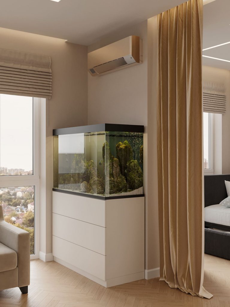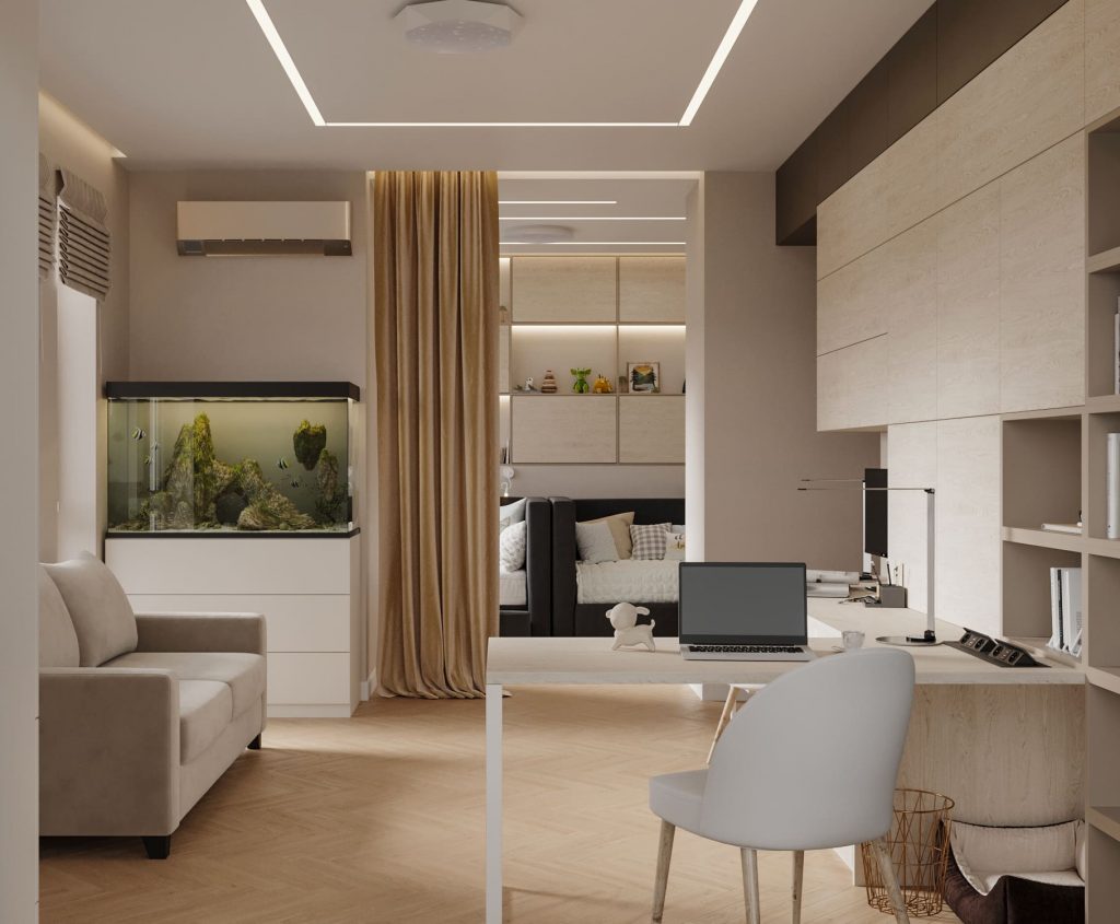 Мы внедрили встроенное освещение с регулируемой яркостью и аквариум, создающий расслабляющую атмосферу. Разделение на зоны с помощью штор позволяет супруге всегда быть рядом с ребёнком, а рабочее место с полками и шкафами обеспечивает удобство для домашней работы. Шкафы с молдингами и открытые полки добавляют элегантности и позволяют персонализировать пространство, отражая индивидуальность семьи.