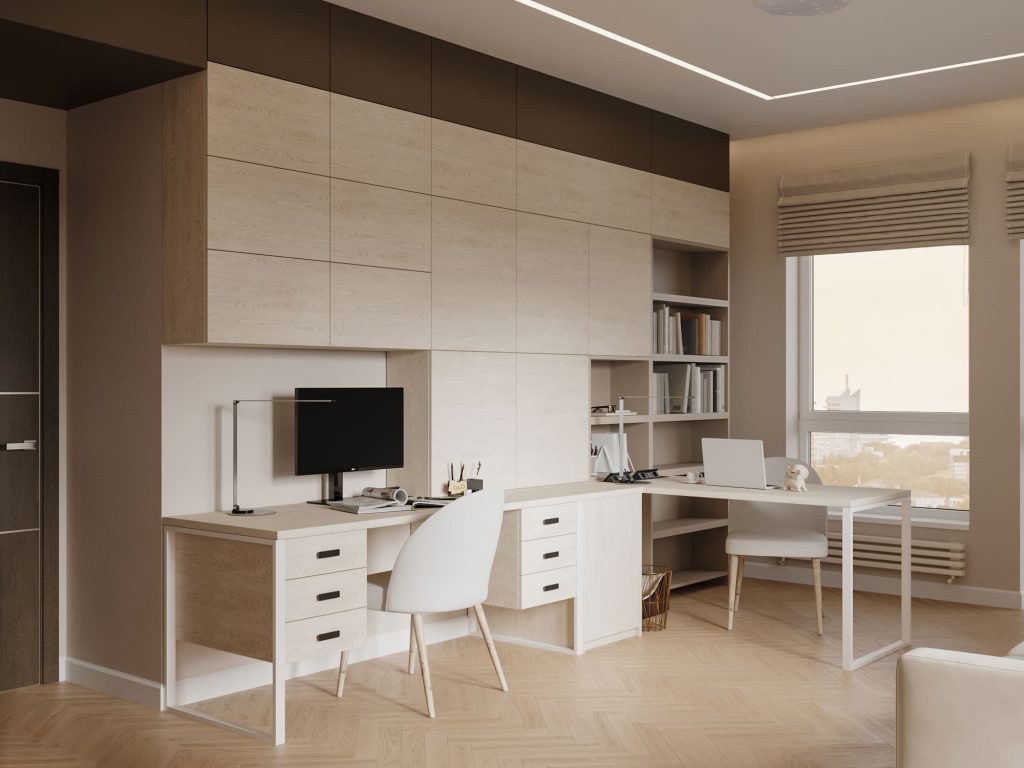 Зная, что заказчик — разработчик игр, увлечённый своей работой, мы оборудовали его кабинет с учётом всех потребностей для продуктивной деятельности. Эргономичное рабочее место с просторным столом и продуманной организацией хранения обеспечивает комфорт и эффективность.