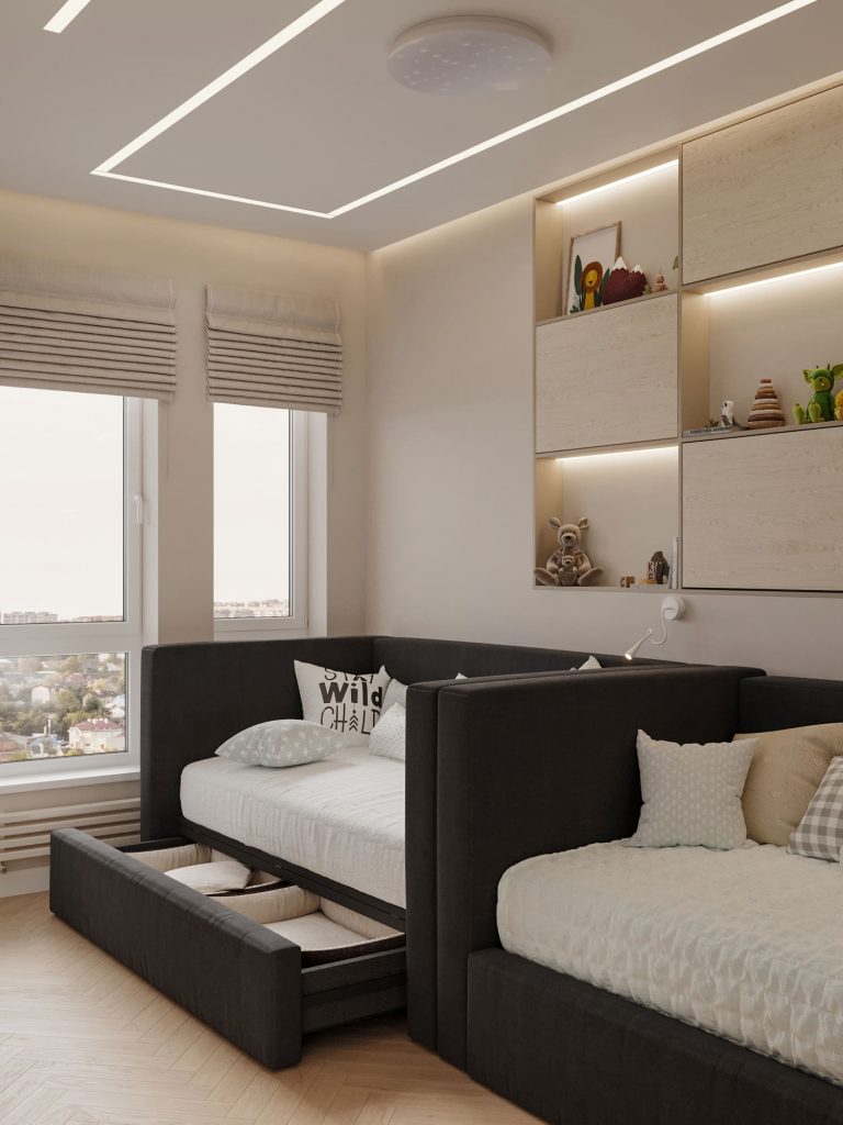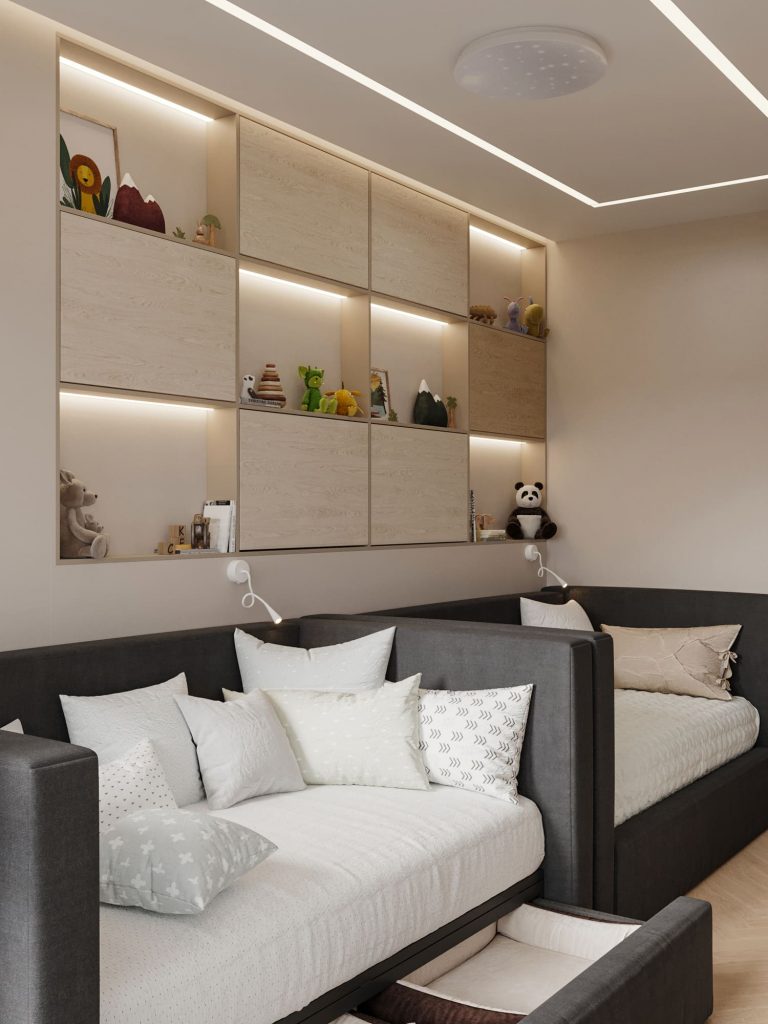 Учитывая необходимость постоянного присутствия мамы рядом с ребёнком, мы предусмотрели для неё дополнительное спальное место в детской. Кровати с выдвижными ящиками обеспечивают комфортный сон и дополнительное хранение, что особенно важно при большом количестве вещей. Встроенные полки и шкафы с освещением создают приятную атмосферу и стимулируют интерес ребёнка к чтению и играм.