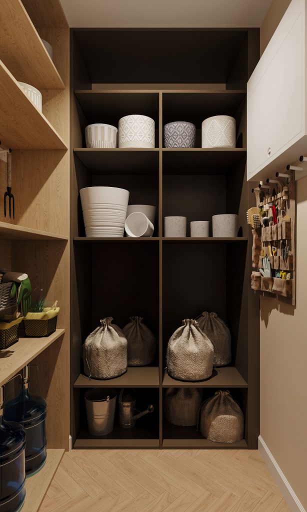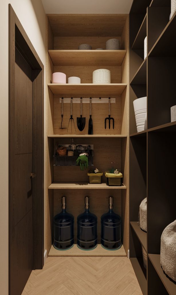 Семья попросила иметь много места для хранения, и учитывая большое количество вещей, мы создали функциональную кладовую. Системы хранения с открытыми и закрытыми полками позволяют организовать пространство для крупных предметов и мелочей. Прочные и устойчивые полки выдерживают значительный вес, обеспечивая безопасность и долговечность. Рациональное использование пространства и эстетичный дизайн делают кладовую не только практичной, но и приятной частью интерьера, что соответствует пожеланиям семьи.