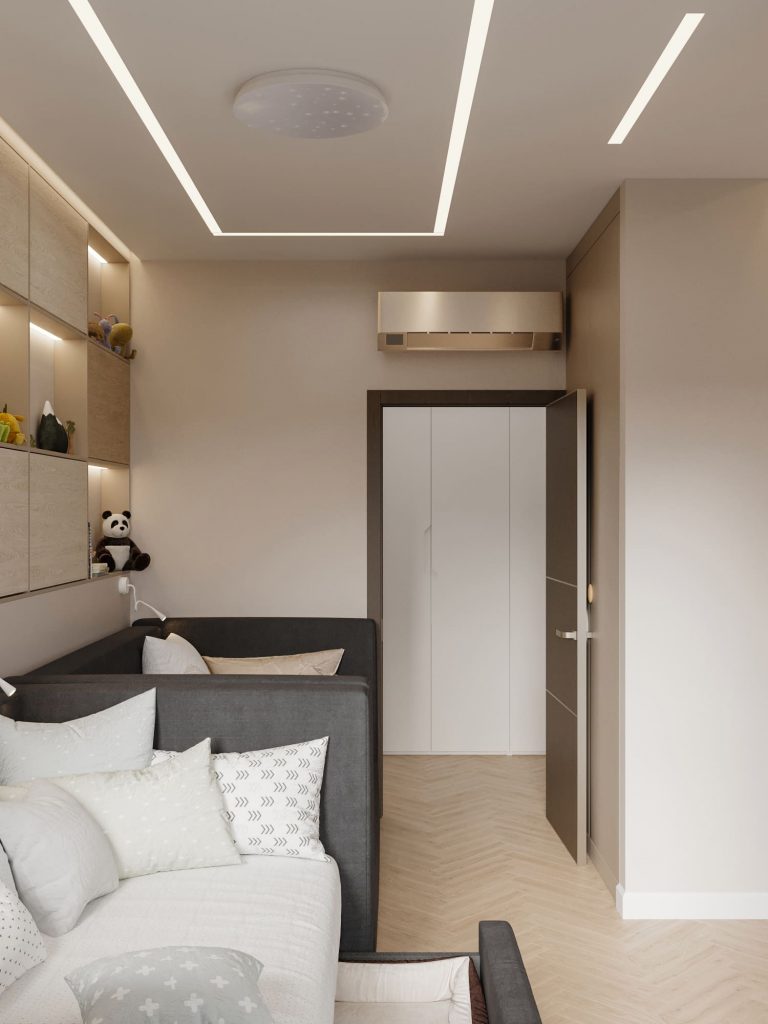 Мы использовали износостойкие материалы в отделке, обеспечивая долговечность и безопасность, что соответствует потребностям активного малыша. Гармоничная световая схема с линейным освещением и ночниками позволяет адаптировать комнату под разные активности — от игр до спокойного сна.