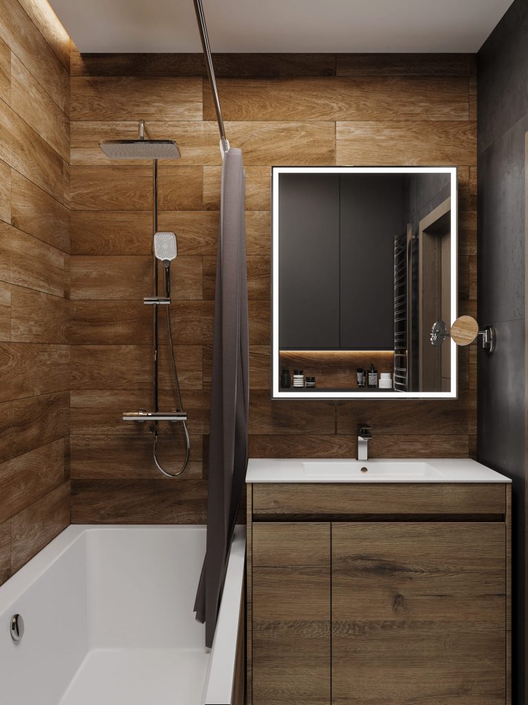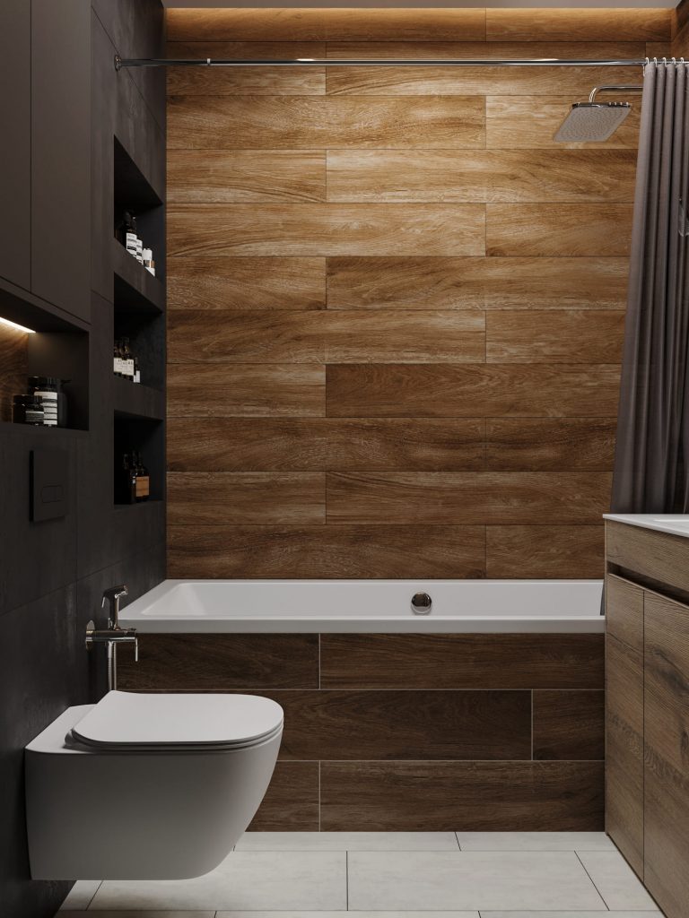 Во втором санузле мы создали атмосферу домашнего спа, используя акцентные деревянные панели с влагостойкой обработкой. Душевая система с тропическим душем и функцией терморегуляции обеспечивает комфорт и расслабление после насыщенного дня. Встроенные шкафы с матовыми фасадами предоставляют дополнительное место для хранения, сохраняя элегантность и минимализм. Потолочное освещение с линейными светильниками дополняет отделку стен, делая интерьер цельным и гармоничным.