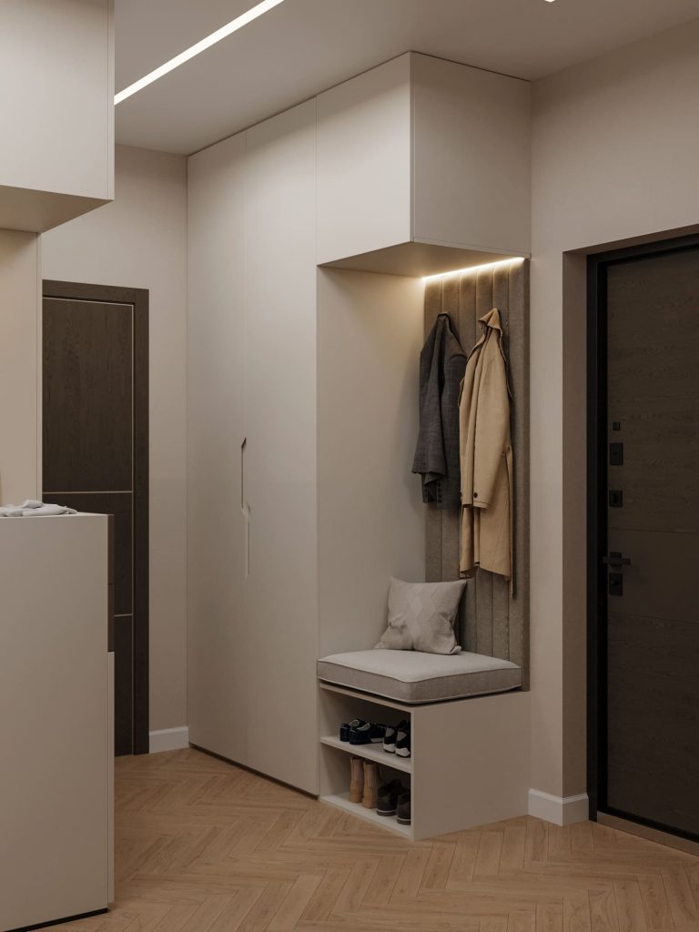Встроенные шкафы с рельефными фасадами и интегрированными ручками предоставляют обильное место для хранения и придают современный минималистичный вид. Мягкий пуф с устойчивым к износу покрытием и открытой системой для обуви делает переобувание удобным для всей семьи. Линейные потолочные светильники создают равномерное освещение, а панели с текстурой дерева добавляют уюта и тепла при входе в дом, так как вещей достаточно много. Это было реализовано в каждой комнате.