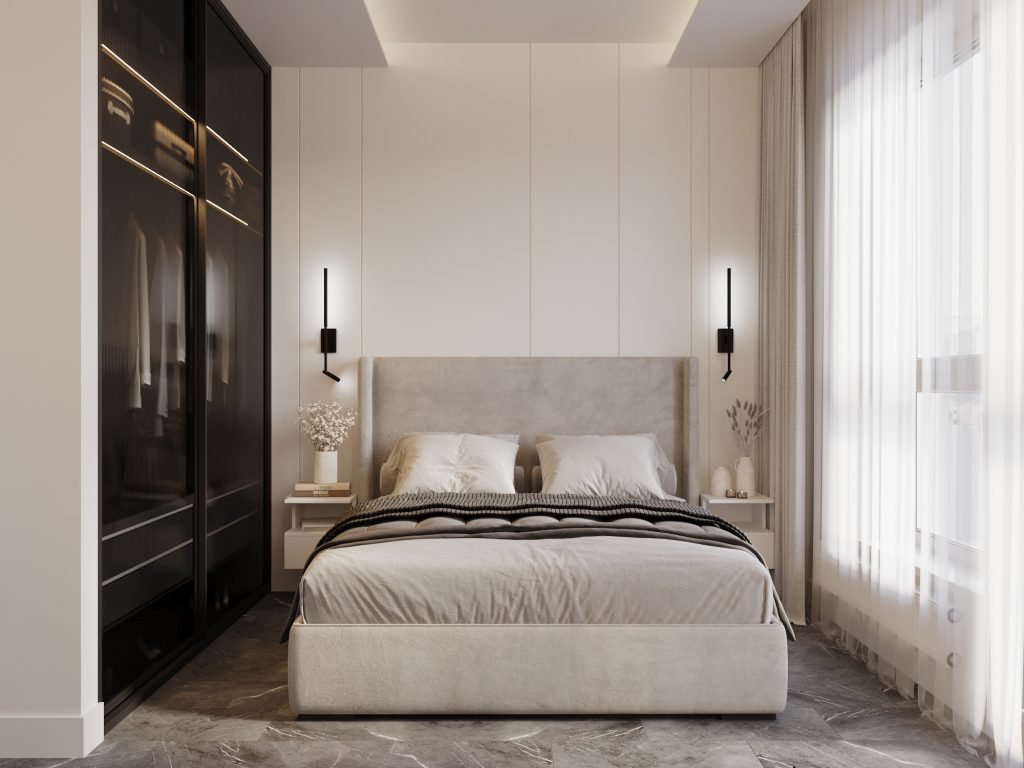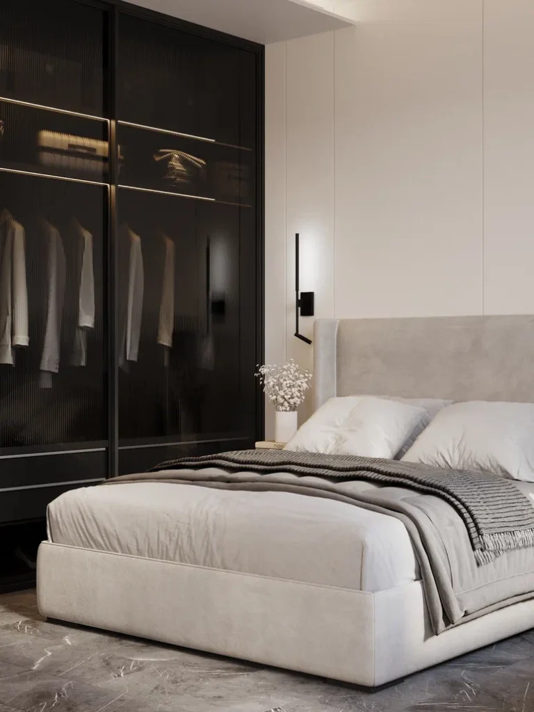 Спальня пронизана светом большого панорамного окна — и мы решили укрепить это ощущение теплой цветовой гаммой, построенной на нюансах. Единственным контрастным элементом здесь является гардероб до потолка, с черными рамами и рельефным стеклом, внутри которого мы предусмотрели подсветку для комфорта эксплуатации.