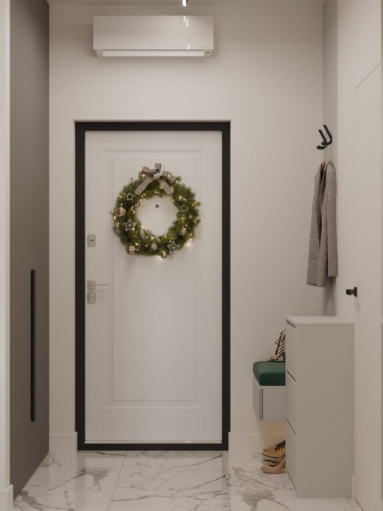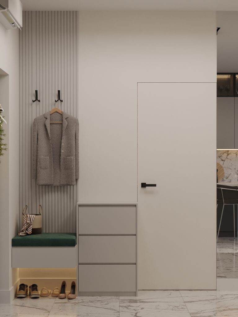 Динамику композиции прихожей создают цветовые и световые акценты. Так, неожиданным изумрудным пятном обозначен консольный пуф. Его же обрамляет снизу теплая подсветка для ниши с обувью. А графичность добавляет контур входной двери и устройство магнитной трековой системы светильников, которым вторят детали фурнитуры (ручки дверей скрытого монтажа, гардероба, крючки для одежды).