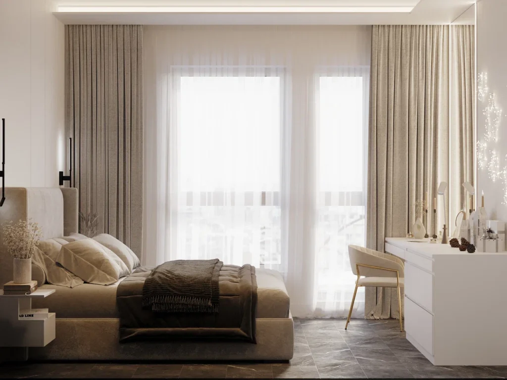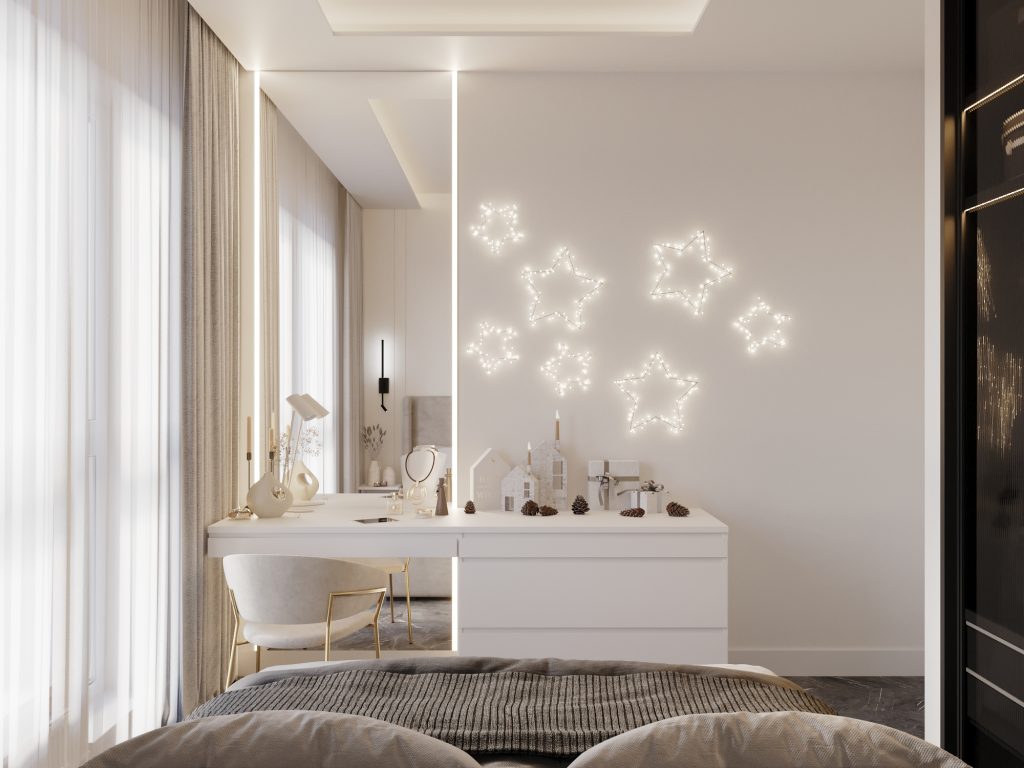 Говоря об использовании пространства и эргономике: мы предусмотрели прикроватные тумбы, у которых есть и открытая полка, и закрытый ящик (не только эстетично, но и очень практично). Зона туалетного столика тоже завершается хранением – светлой вместительной тумбой.