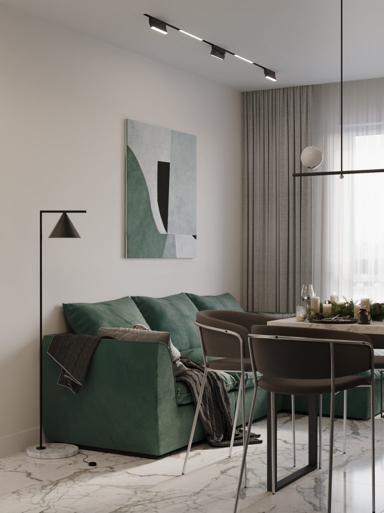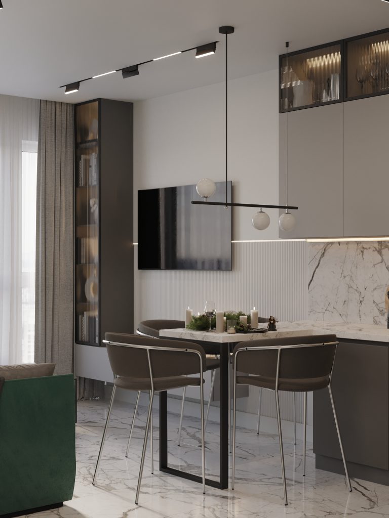Стоит отметить разнообразие источников света — мы продумали разные сценарии использования пространства. Например, рабочую поверхность кухни оборудовали теплой подсветкой по периметру, над столом предусмотрели акцентный подвесной светильник. Общее освещение представлено трековой системой, установленной заподлицо с потолком, а уют создает геометричный торшер возле дивана.
