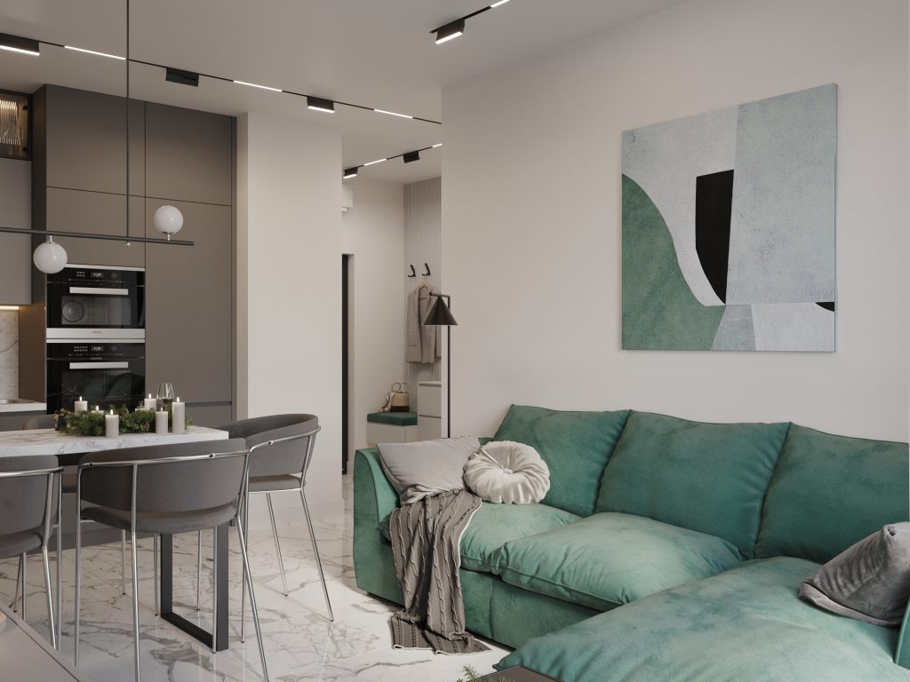 Квартира евродвушка в современном стиле для молодой девушки в бежевых оттенках с изумрудными акцентами, с прихожей, кухней-гостиной, спальней и санузлом