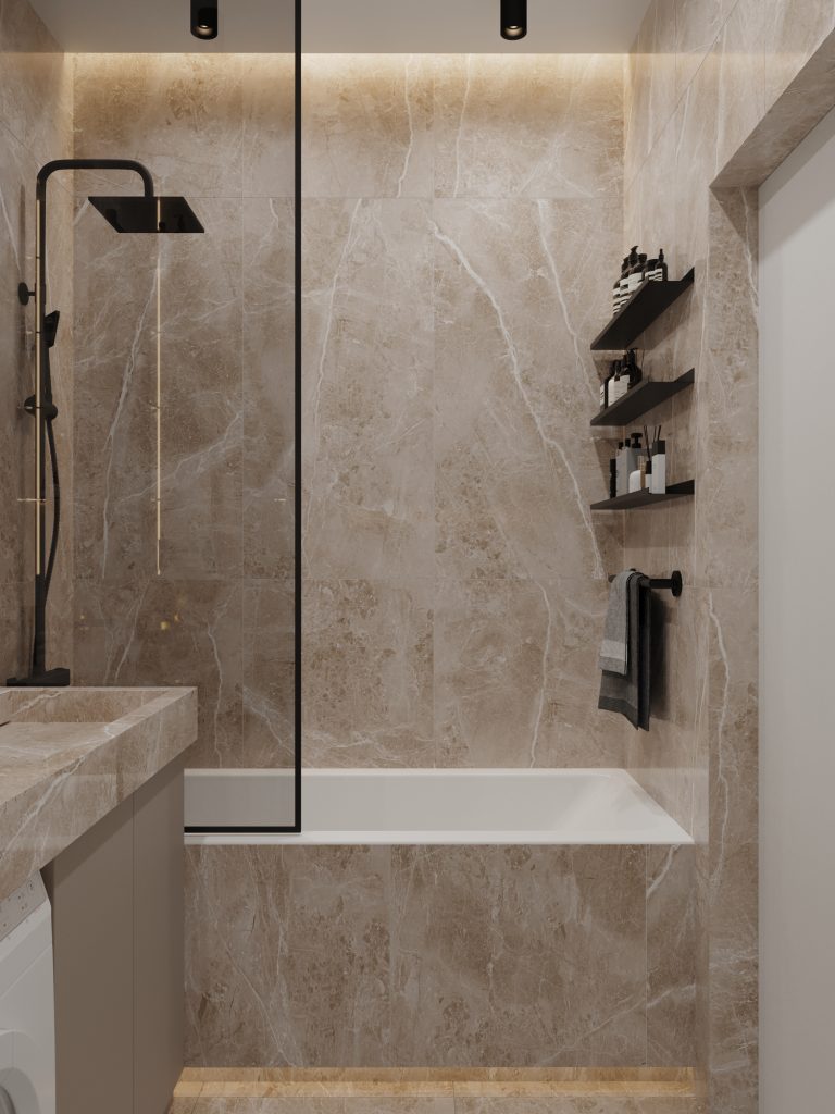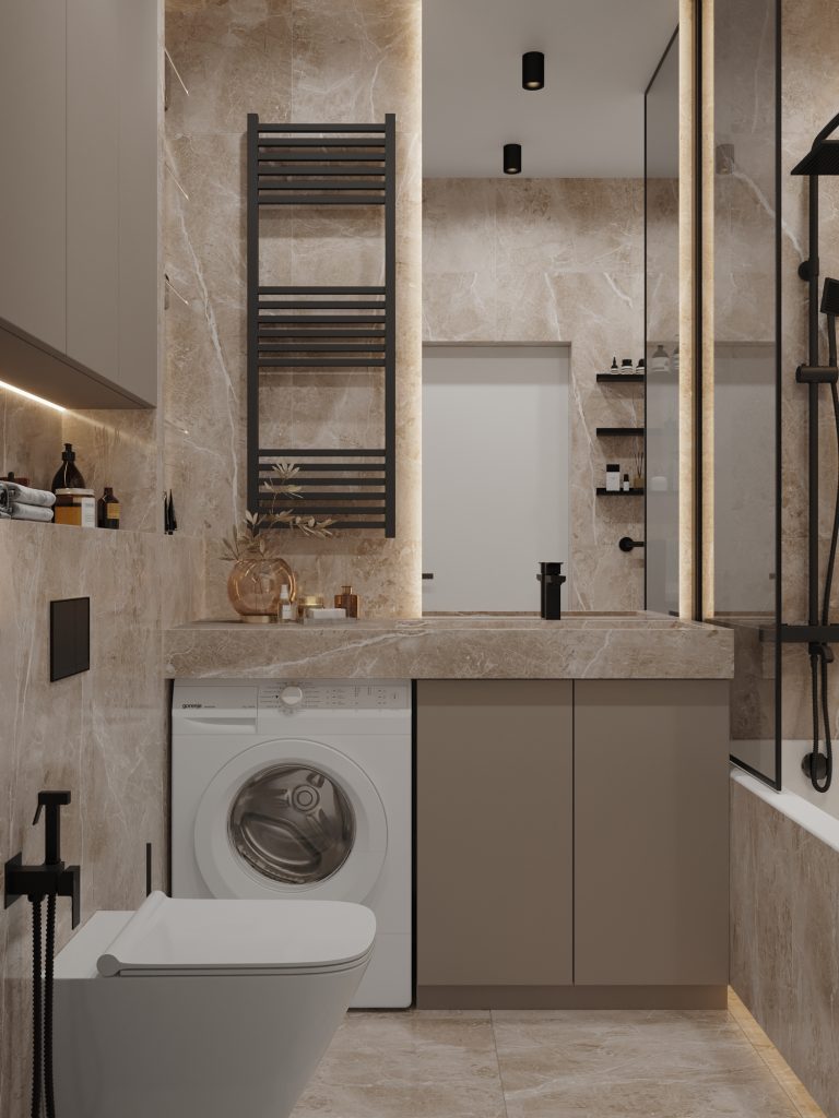 В санузле мы продолжили идею теплоты общего пространства, которую обеспечивают керамогранит с текстурой камня, фасады кофейного оттенка и подсветка. Множество мест хранения, открытого и закрытого — одно из главных пожеланий заказчицы. Первый тип представлен здесь небольшими полками в зоне ванной и в нише возле раковины, а также полкой над инсталляцией. Несмотря на небольшие габариты, поместилась в пространстве и стиральная машина под широкой столешницей со встроенной раковиной, и ванная со стеклянной перегородкой, и полотенцесушитель. Яркий пример того, как функциональна может быть даже небольшая площадь.
