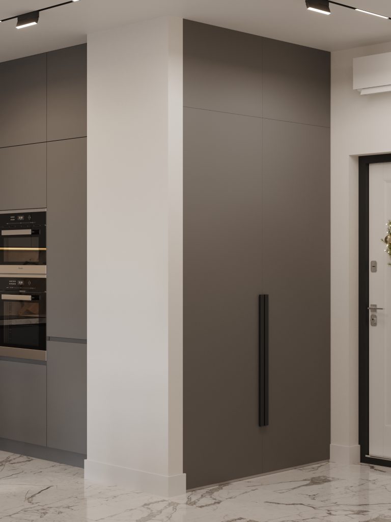 Говоря о хранении, стоит отметить отдельно антресольные модули с рельефным стеклом и теплой подсветкой — место для эстетичной праздничной посуды, силуэты которой будут проглядываться, создавая особый ритм.