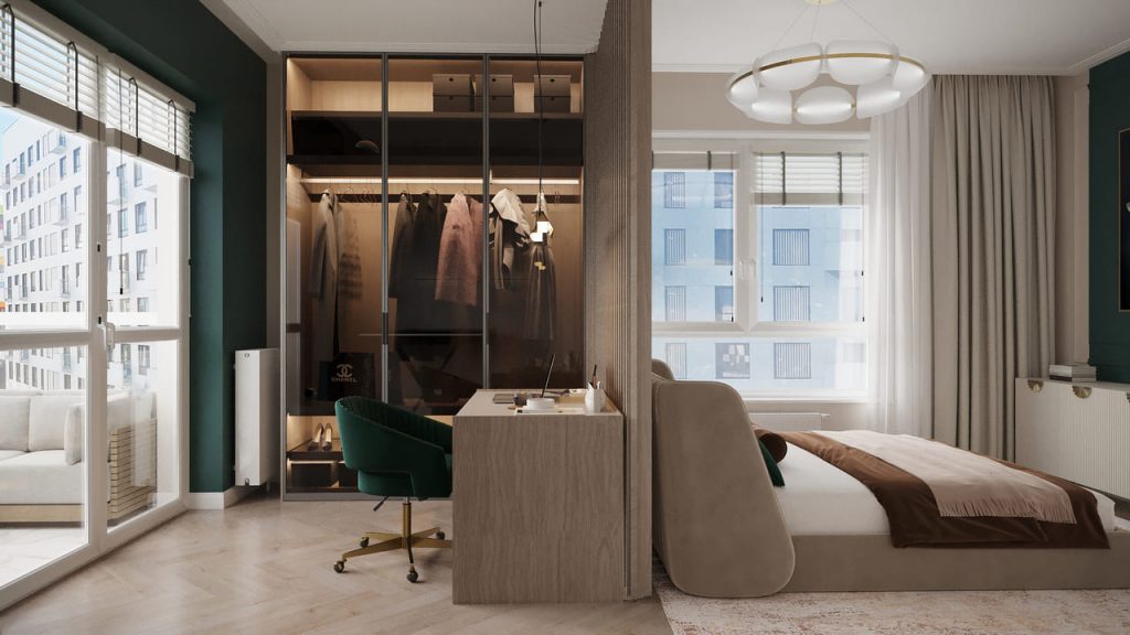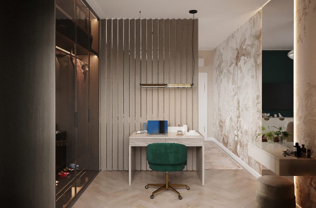 За основу взяты мягкие бежевые и серые тона, а главную роль в цветовой композиции снова играет изумрудная акцентная стена — визуальная отсылка к другим зонам квартиры и часть общей концепции. Современный стол с чёрной столешницей и удобным эргономичным креслом создают комфортное рабочее место с правильной организацией: тут легко разместить всё необходимое, не перегружая интерьер.