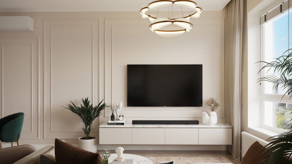 Гостиная — это место отдыха, общения и тишины. Мягкий угловой диван с пуфом, комфортные кресла, журнальный столик с мраморной столешницей и арт-фреска на изумрудной стене создают атмосферу, в которую хочется вернуться. Телевизионная зона оформлена лаконично: подвесная тумба, объёмная лепнина и стильный декор завершают образ.